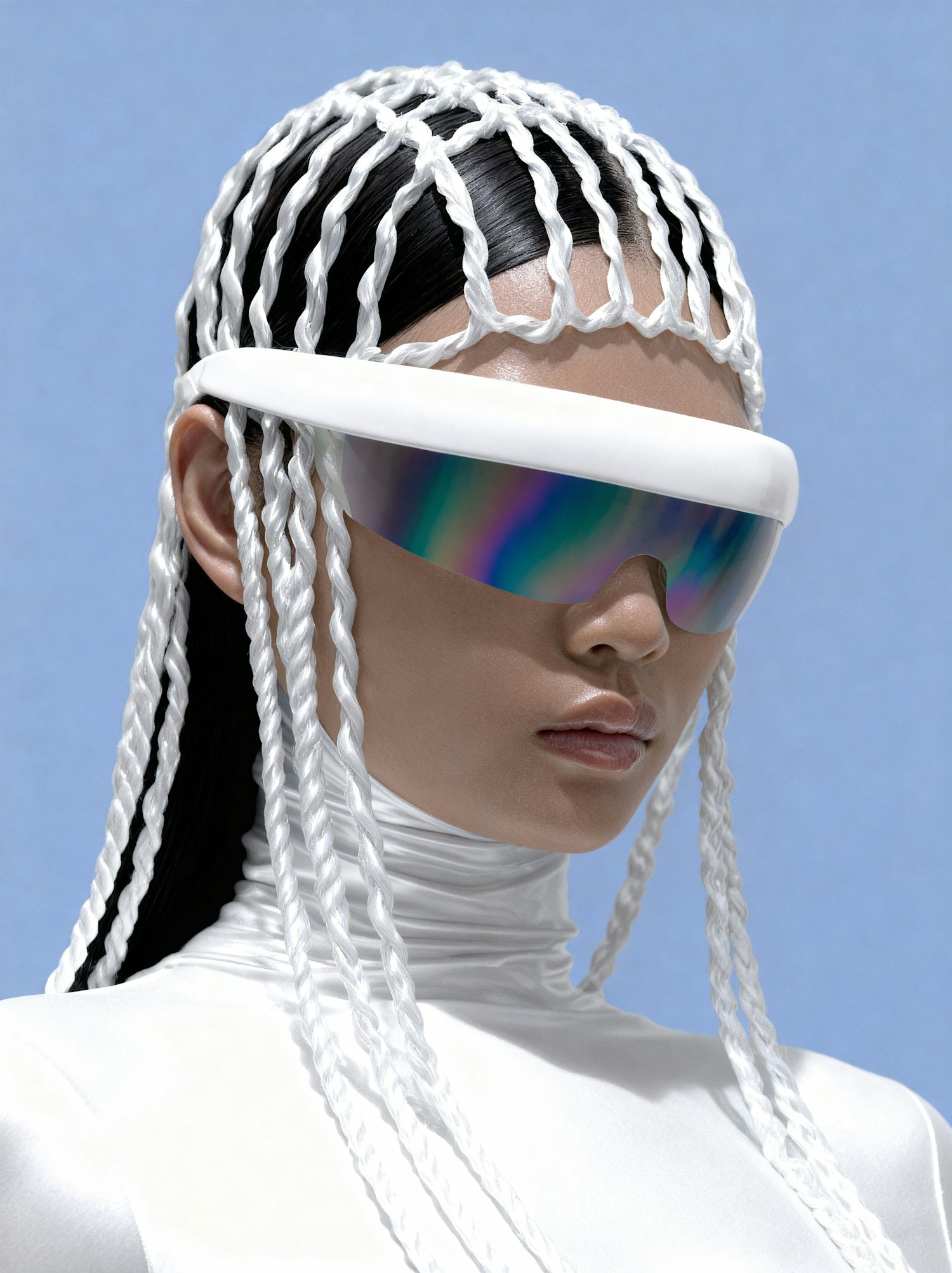 Futuristic portrait of a person with a high-tech visor and unique white rope-like hairstyle against a light blue background.