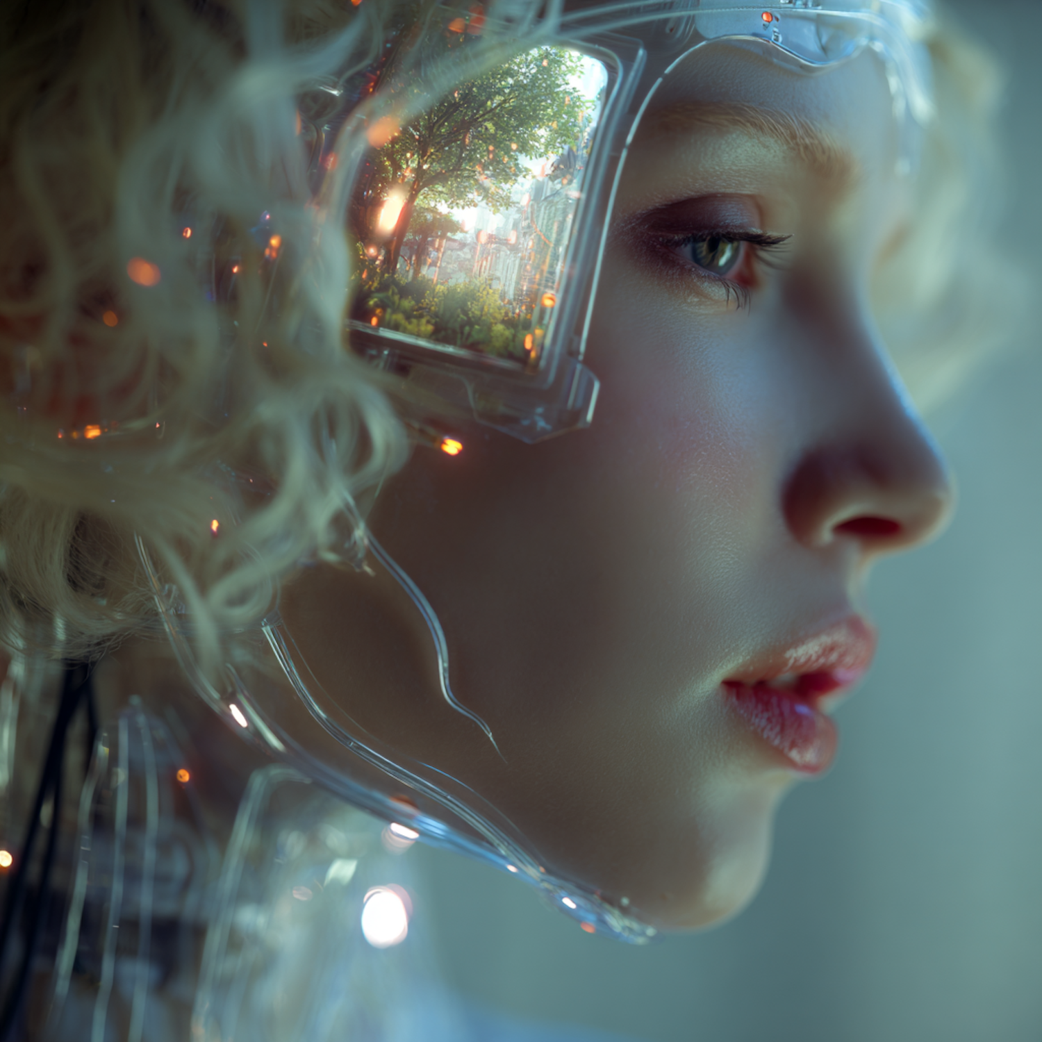 A futuristic close-up of a person with a transparent visor reflecting a serene outdoor scene, blending technology and nature.