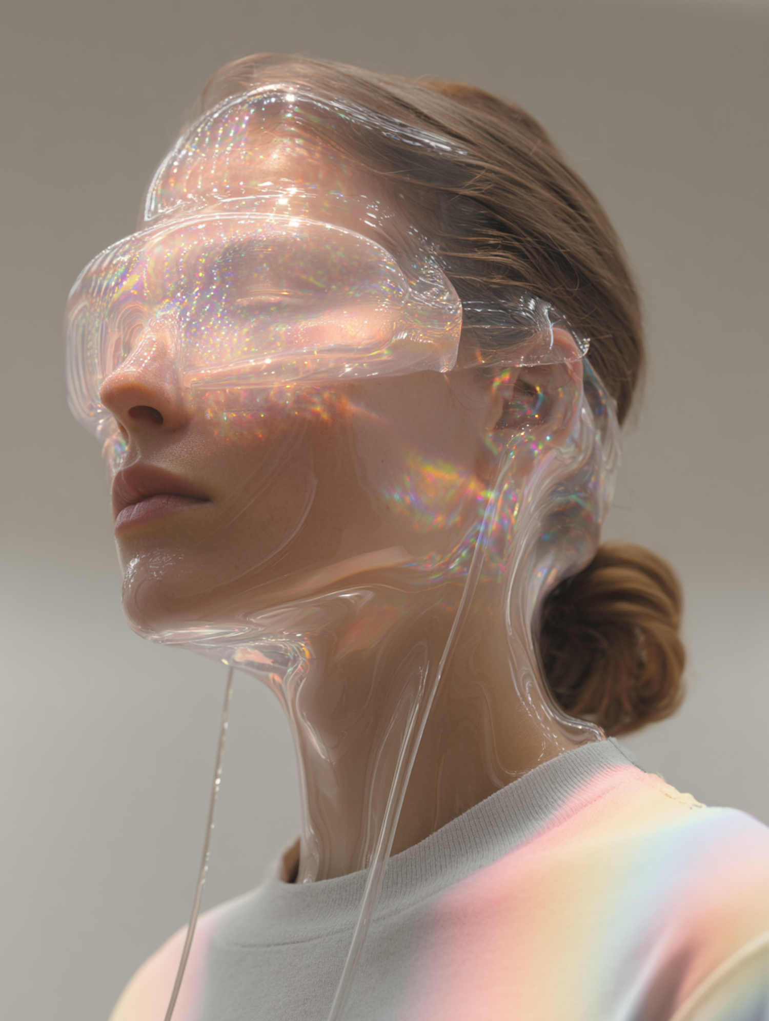 A futuristic portrait of a person wearing a transparent visor refracting light into rainbows, set against a neutral background.