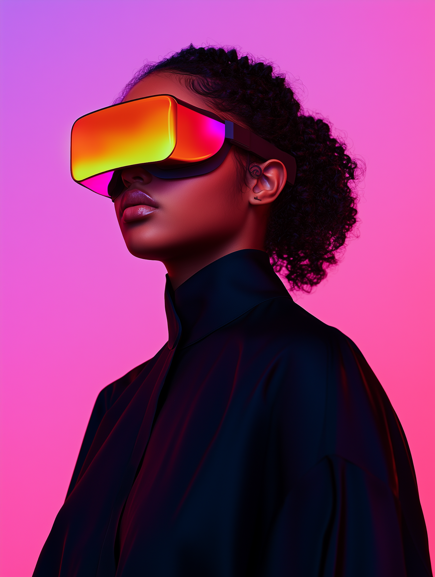 A stylish woman in a reflective VR headset against a neon pink and purple background, blending futuristic tech with bold aesthetics.