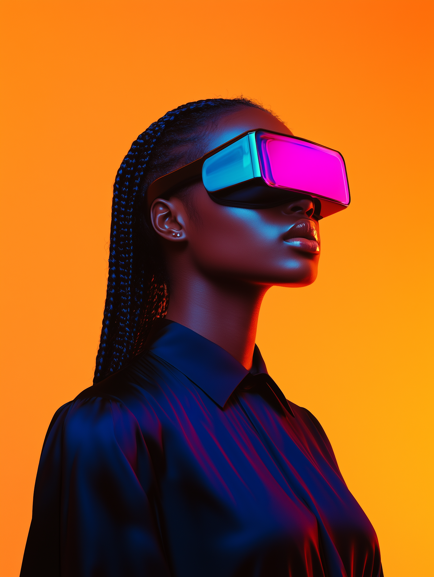 A futuristic portrait of a woman in VR goggles against a bold orange background, blending tech and style with vibrant colors.