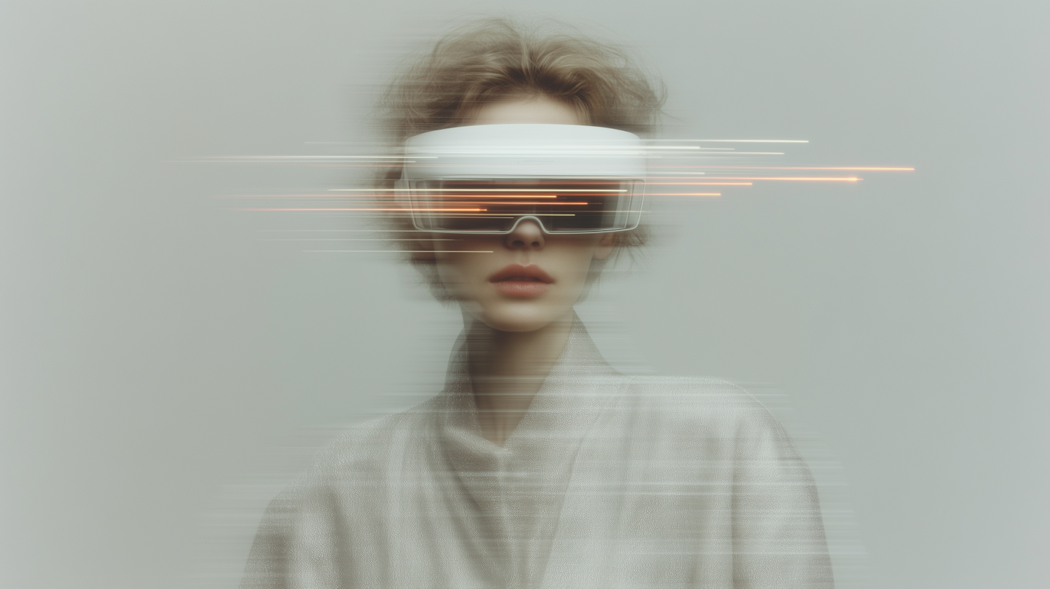 A person wearing a futuristic white VR headset with glowing streaks, set against a minimalistic background, evoking a high-tech vibe.