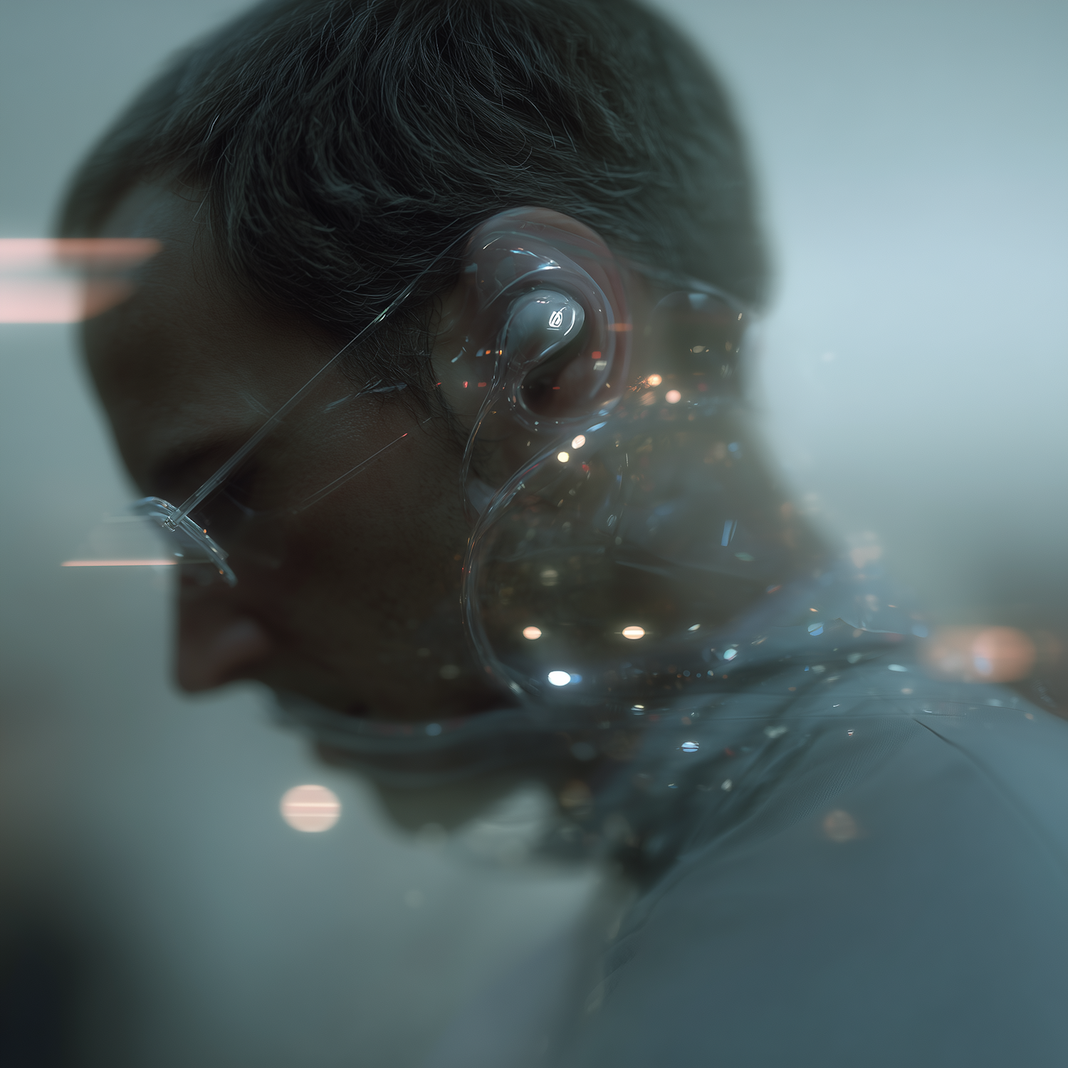 A futuristic close-up of a person wearing a transparent, glowing device, set against a softly blurred background for a sci-fi aesthetic.