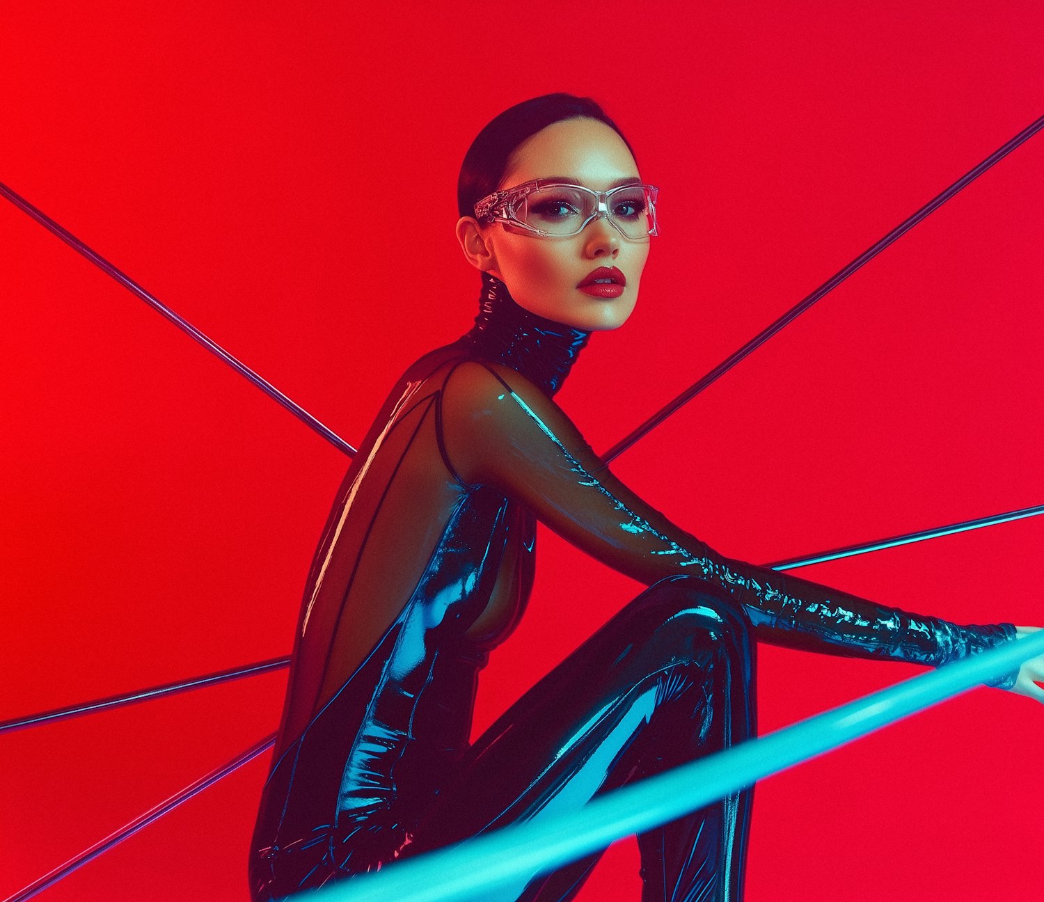 Futuristic fashion portrait of a woman in a sleek black bodysuit and clear glasses against a vibrant red background.