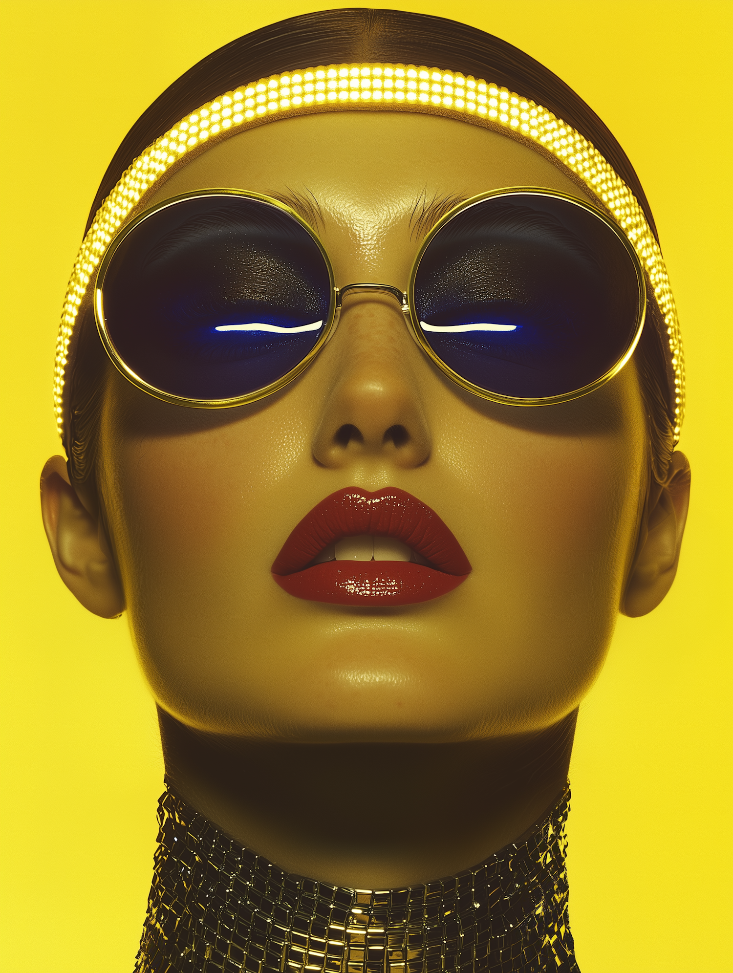 Bold close-up of a woman with reflective sunglasses, red lips, LED headband, and metallic choker against a vivid yellow background.
