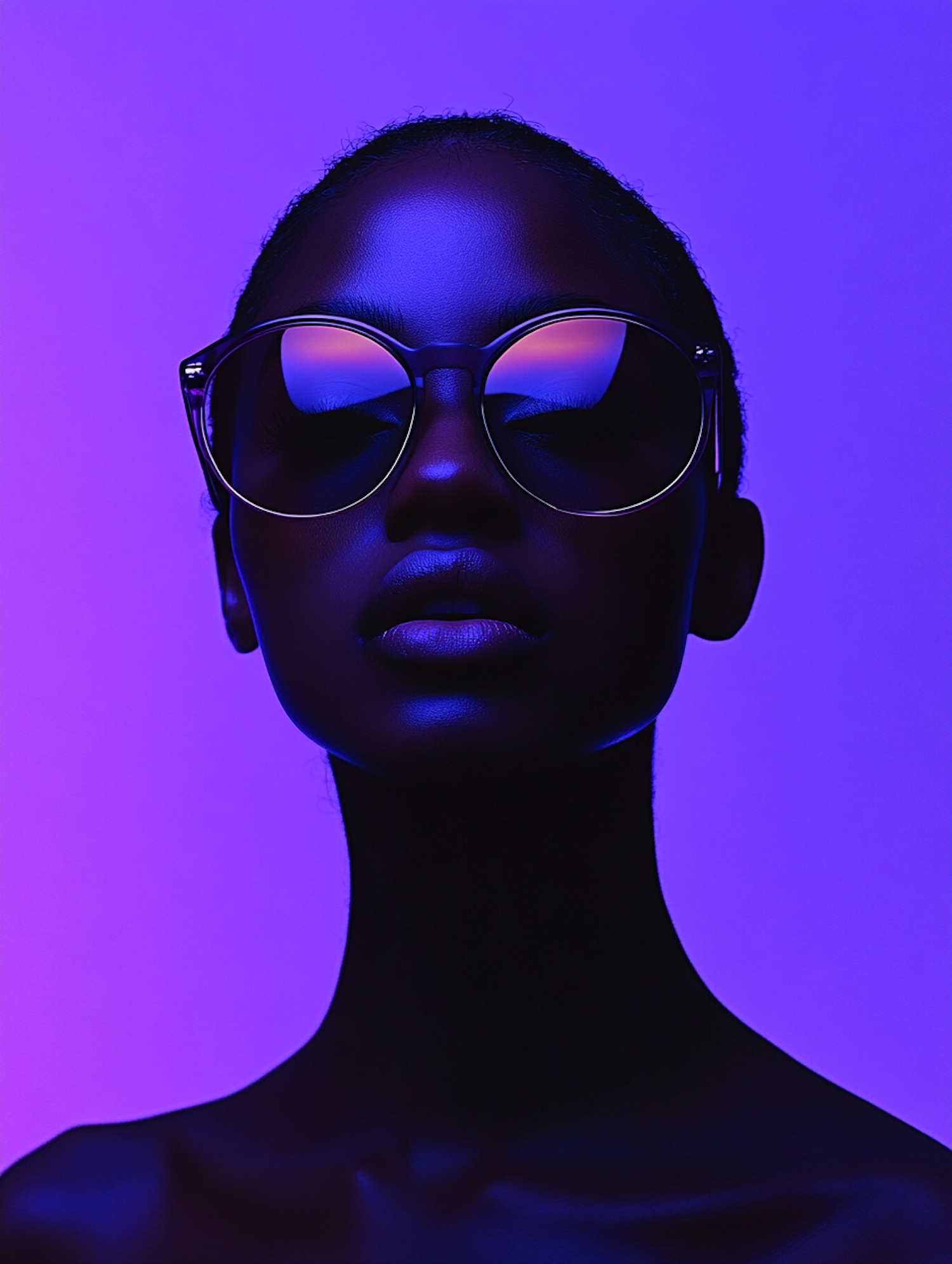 A bold portrait of a woman in reflective sunglasses, bathed in vibrant purple and blue lighting, creating a futuristic and artistic vibe.