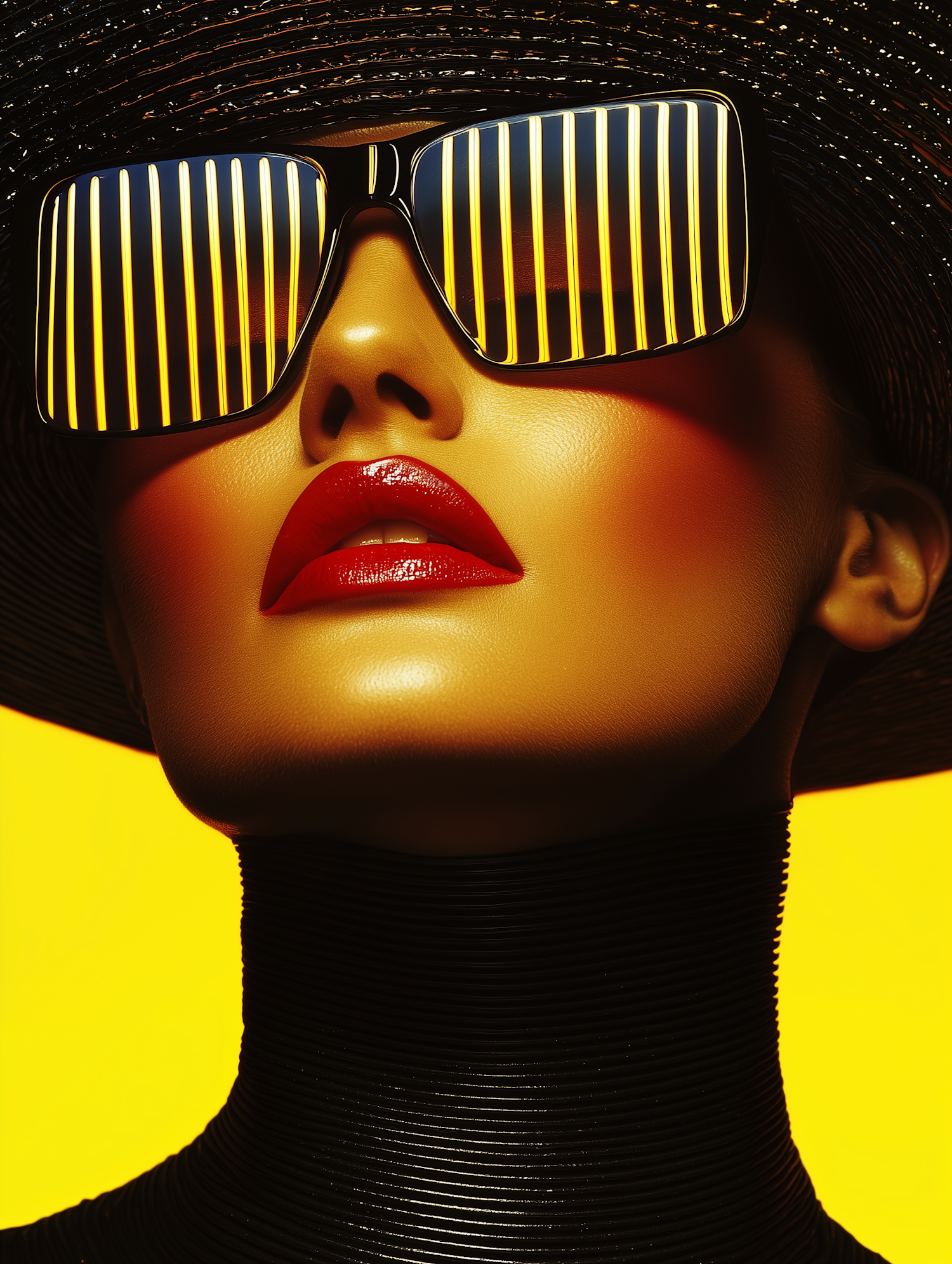 Bold close-up of a woman with striped sunglasses, red lips, and a futuristic black high-neck accessory against a vivid yellow background.