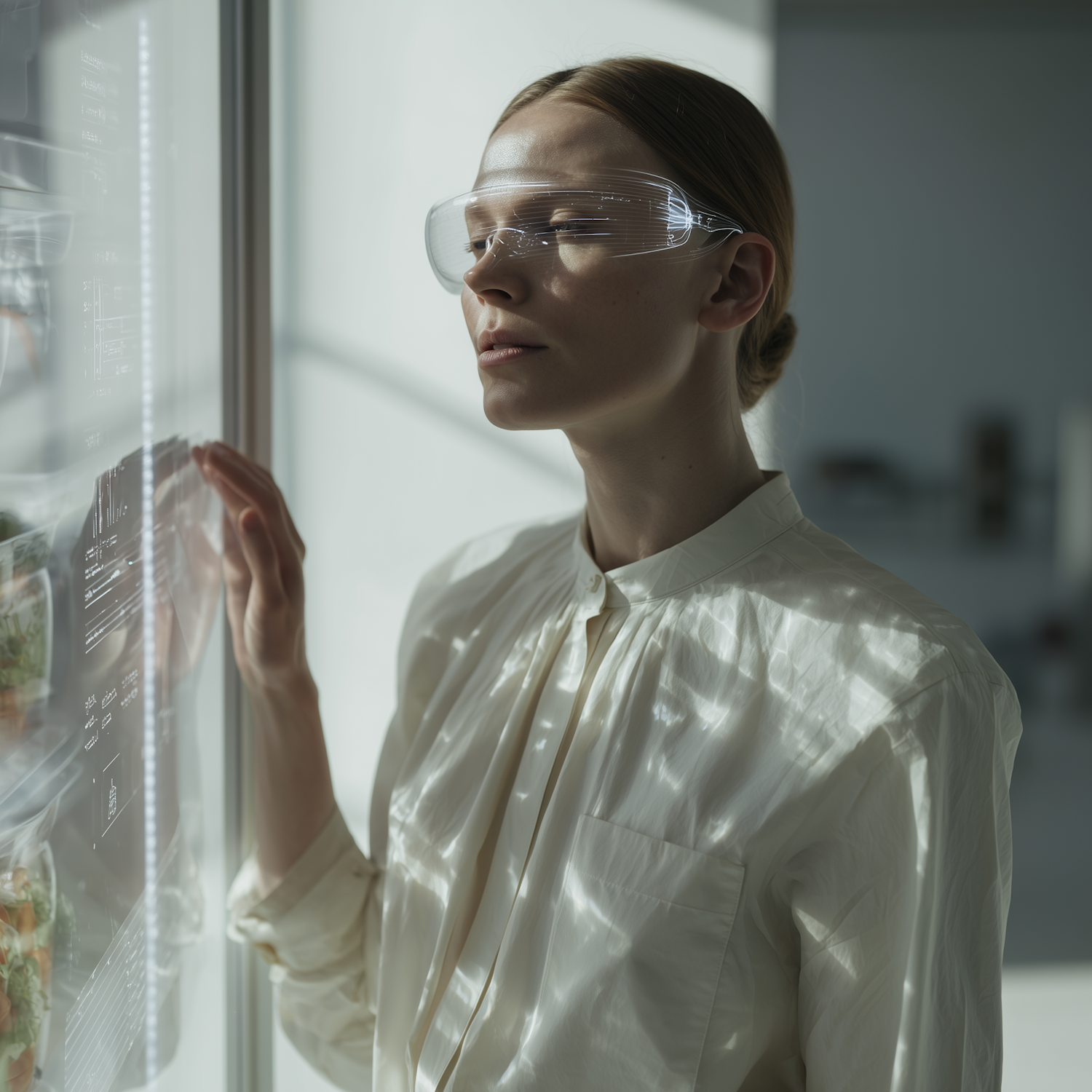 A woman wearing futuristic transparent glasses interacts with a holographic display on a glass panel in a modern, minimalistic setting.