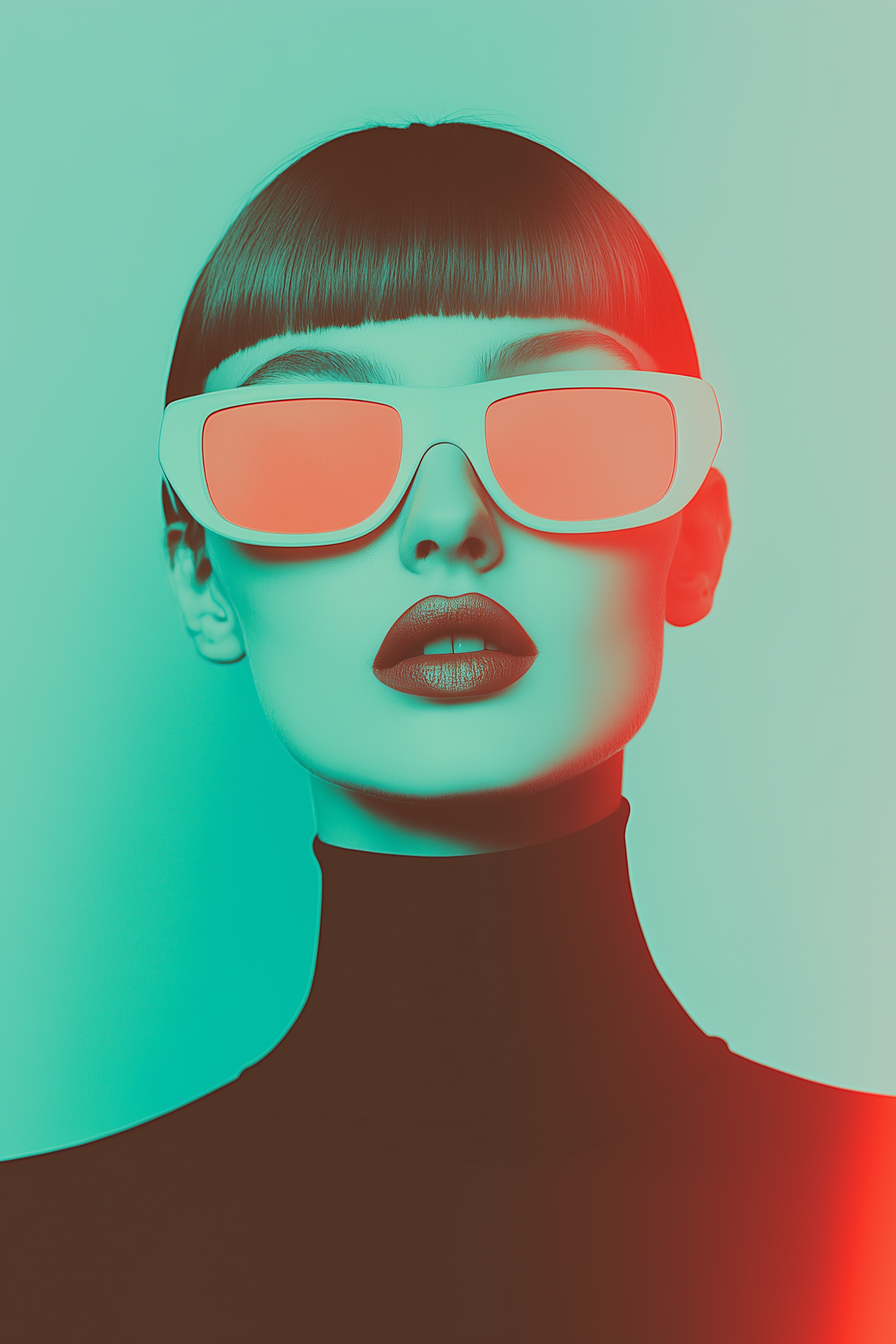 Futuristic portrait of a woman in bold red sunglasses, black turtleneck, and neon teal-red lighting for a striking modern aesthetic.