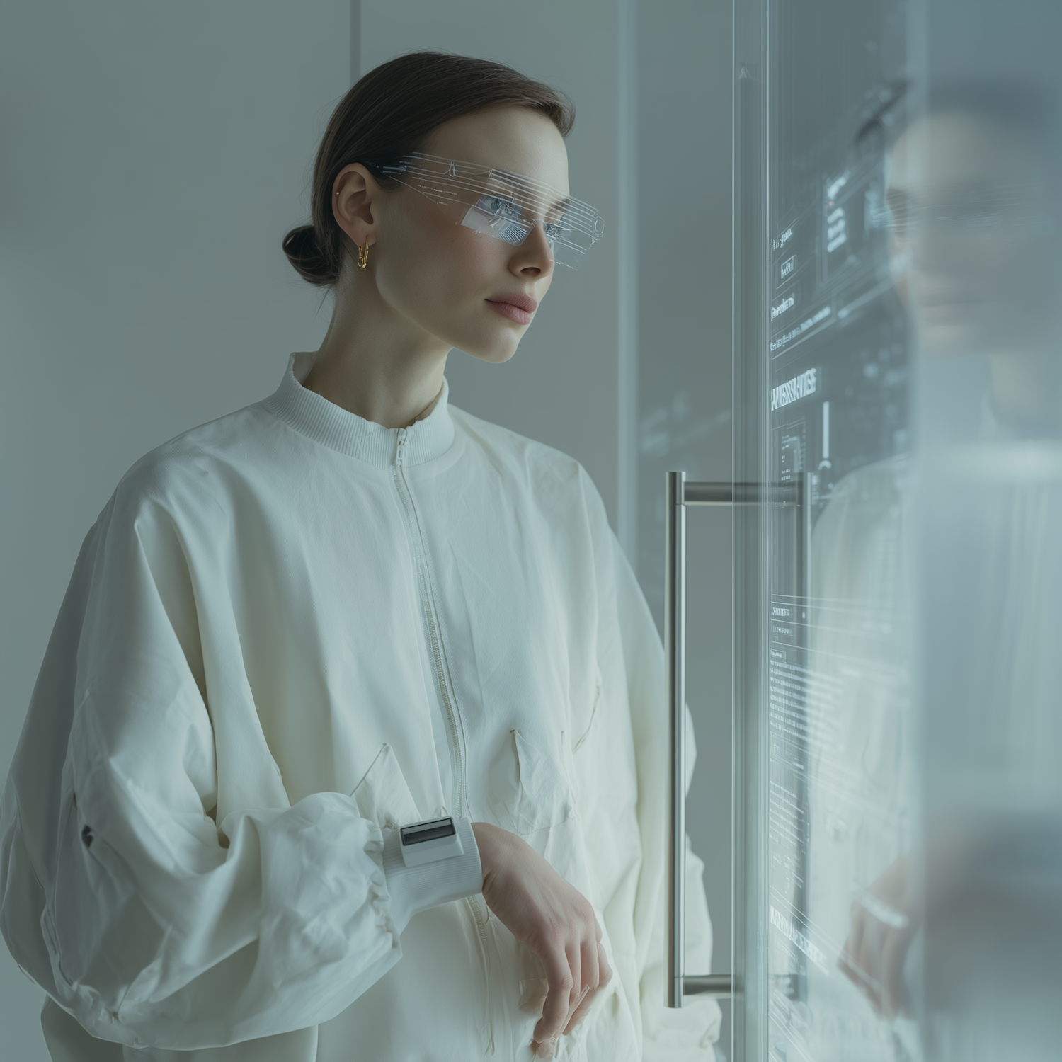 A woman in a white jacket and futuristic glasses interacts with a digital display in a sleek, modern setting.