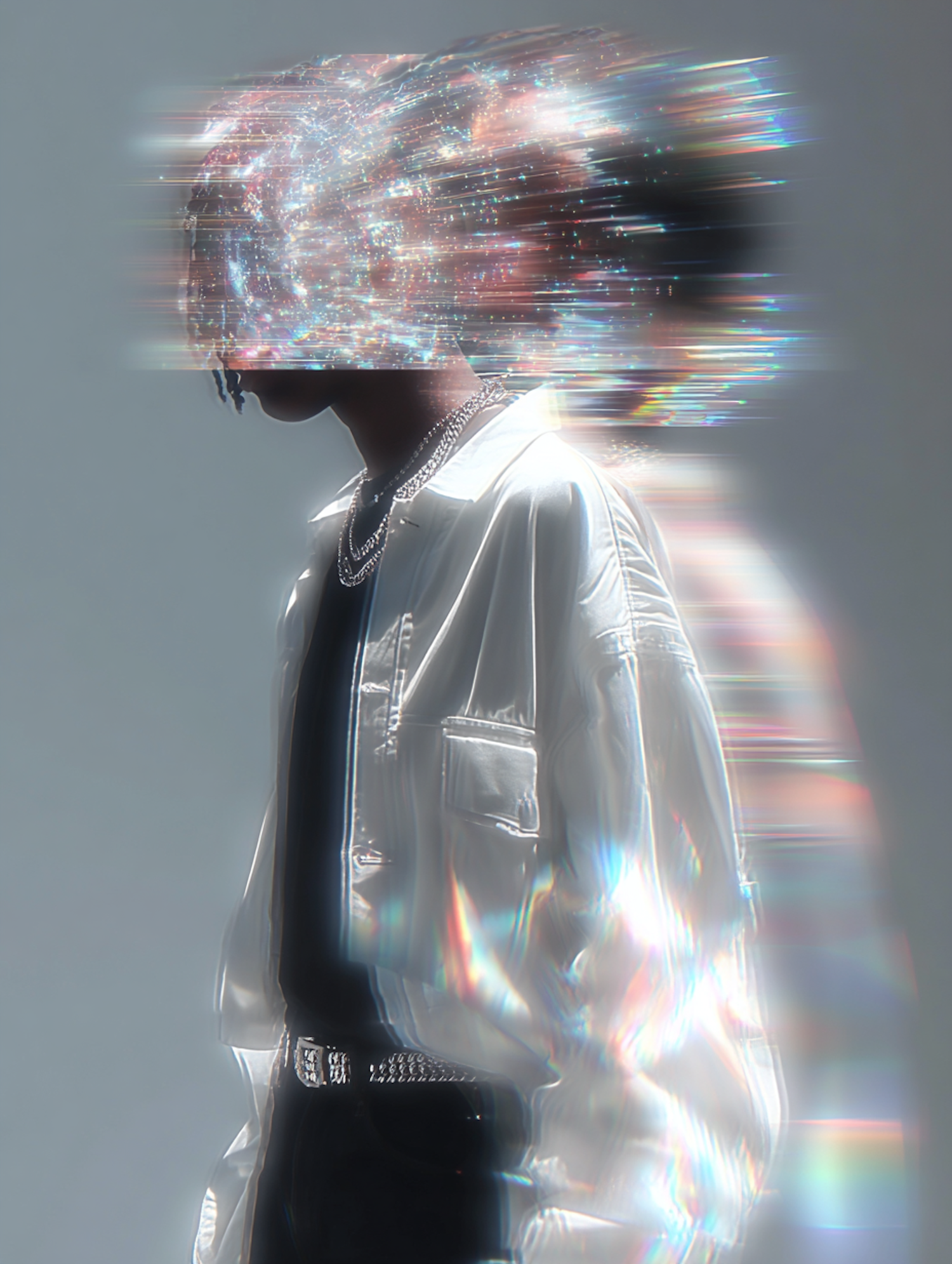 A surreal portrait of a person with a galaxy-like light effect replacing their head, wearing a shiny white jacket and silver chains.