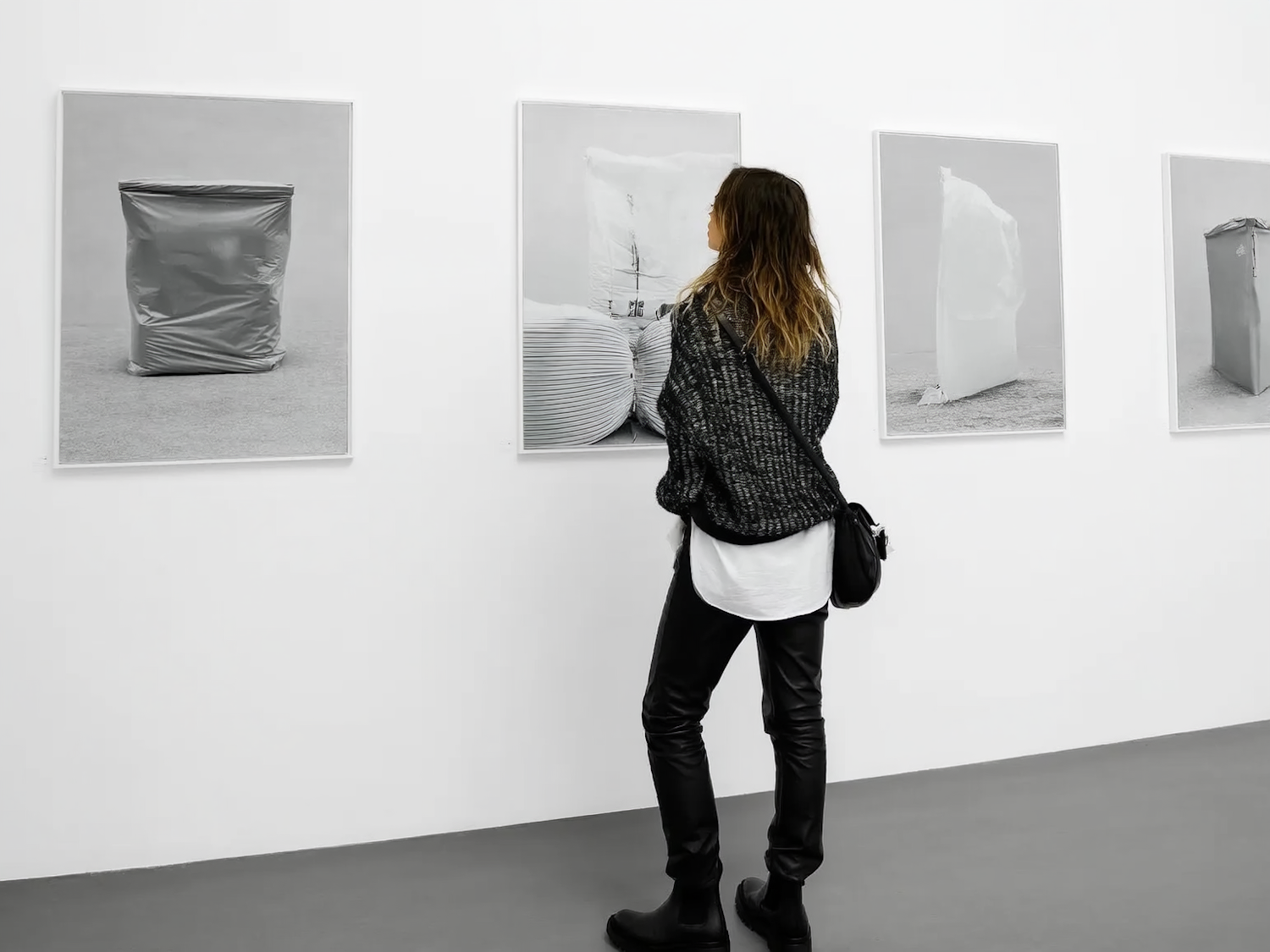 A person in a gallery observes abstract monochrome photographs of wrapped objects, creating a minimalist and contemplative scene.