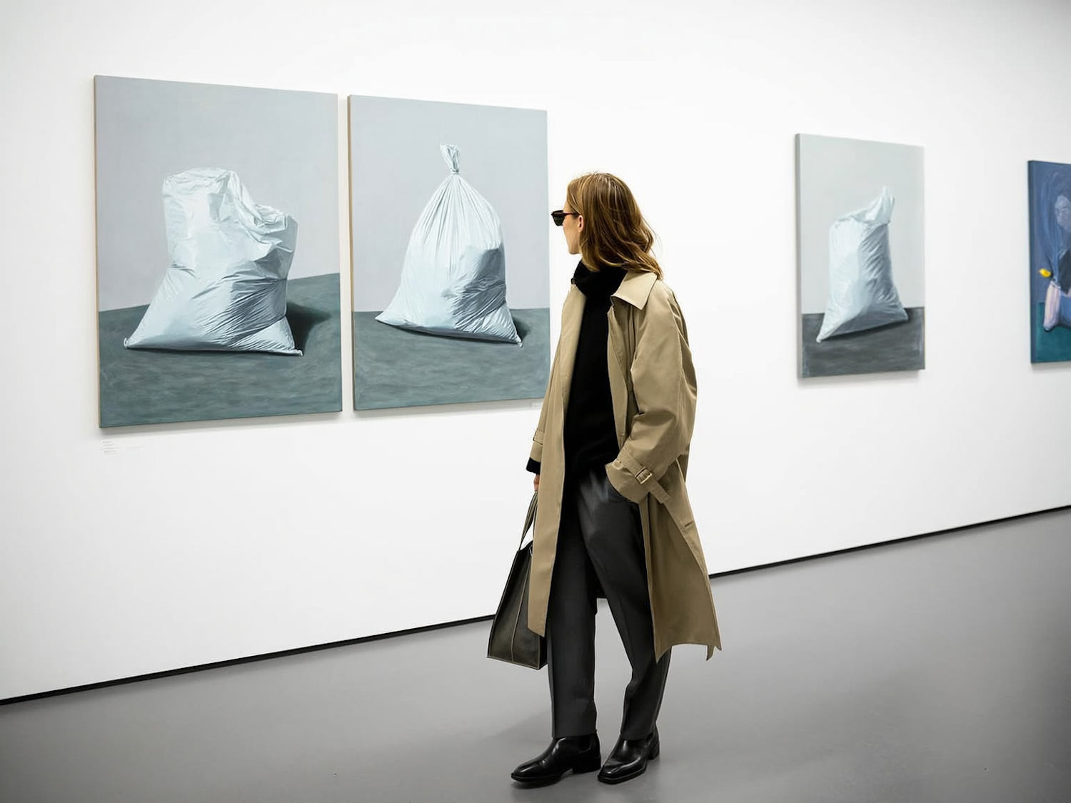 A person in a trench coat observes realistic paintings of plastic bags in a minimalist art gallery.