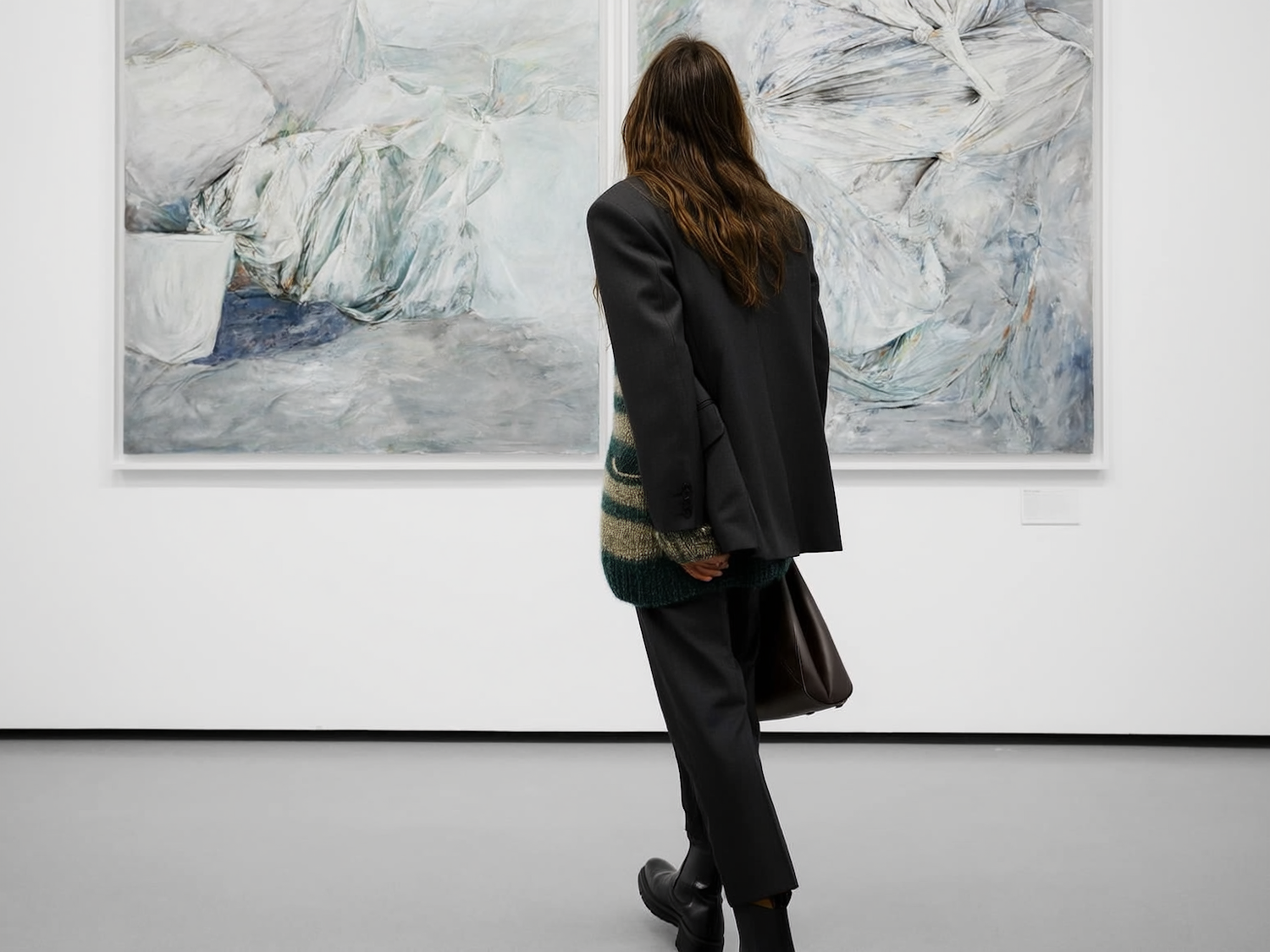 A person in a gallery observes abstract paintings, dressed in a dark suit and green sweater, creating a modern and artistic atmosphere.