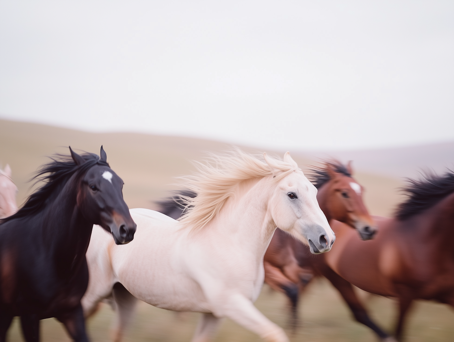 A dynamic scene of horses galloping across a field, featuring a striking white horse in the center with flowing mane and powerful movement.