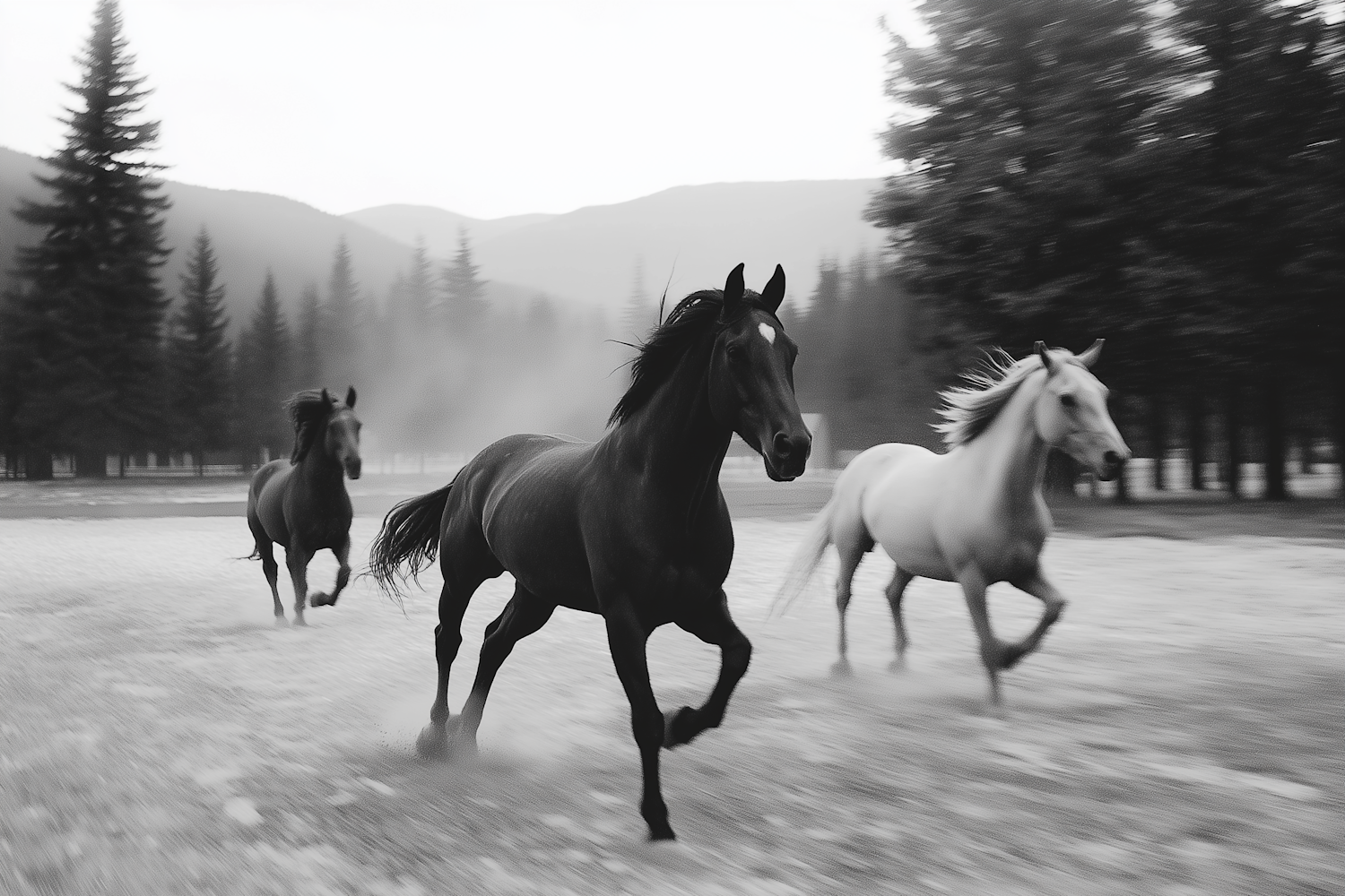 Three majestic horses gallop through a snowy field, framed by a misty forest and mountains in the background. A stunning monochrome shot.