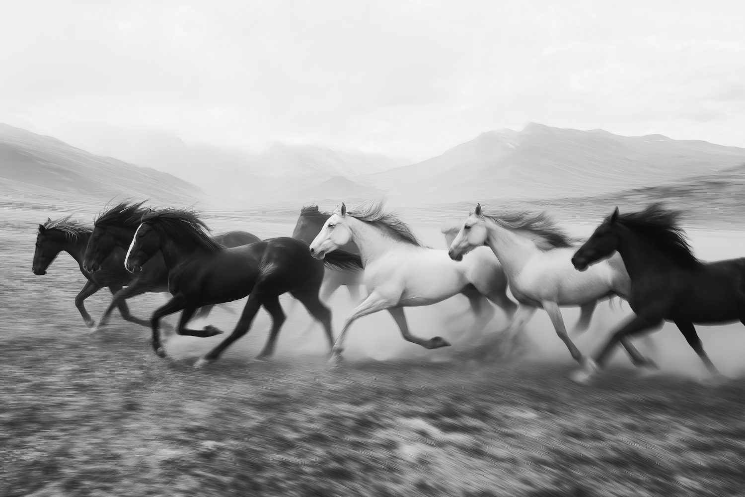 A stunning black-and-white shot of galloping horses on a misty plain, showcasing their power and grace in a dramatic landscape.