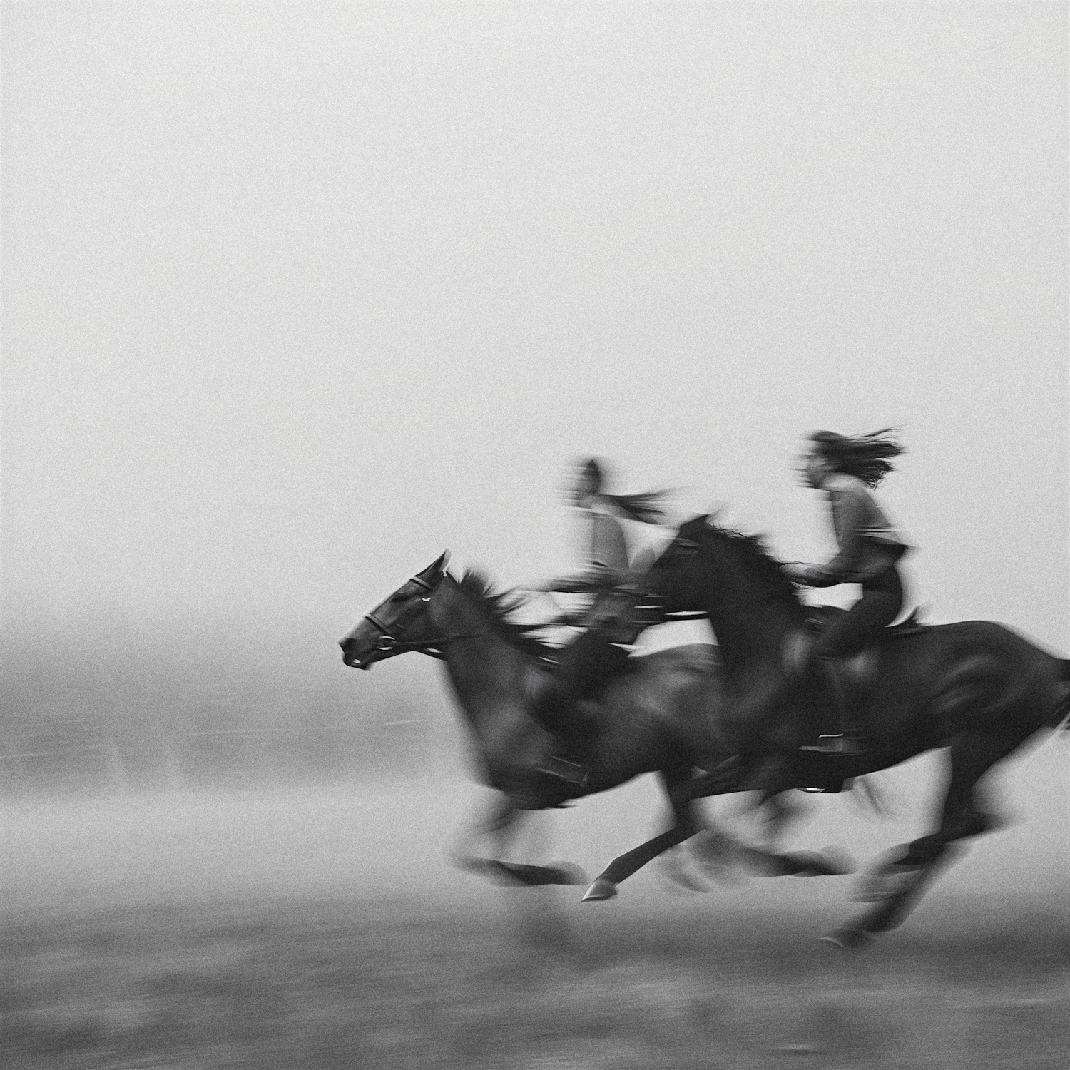Two riders gallop on horses through a misty field, captured in a dynamic black-and-white motion blur, emphasizing speed and grace.