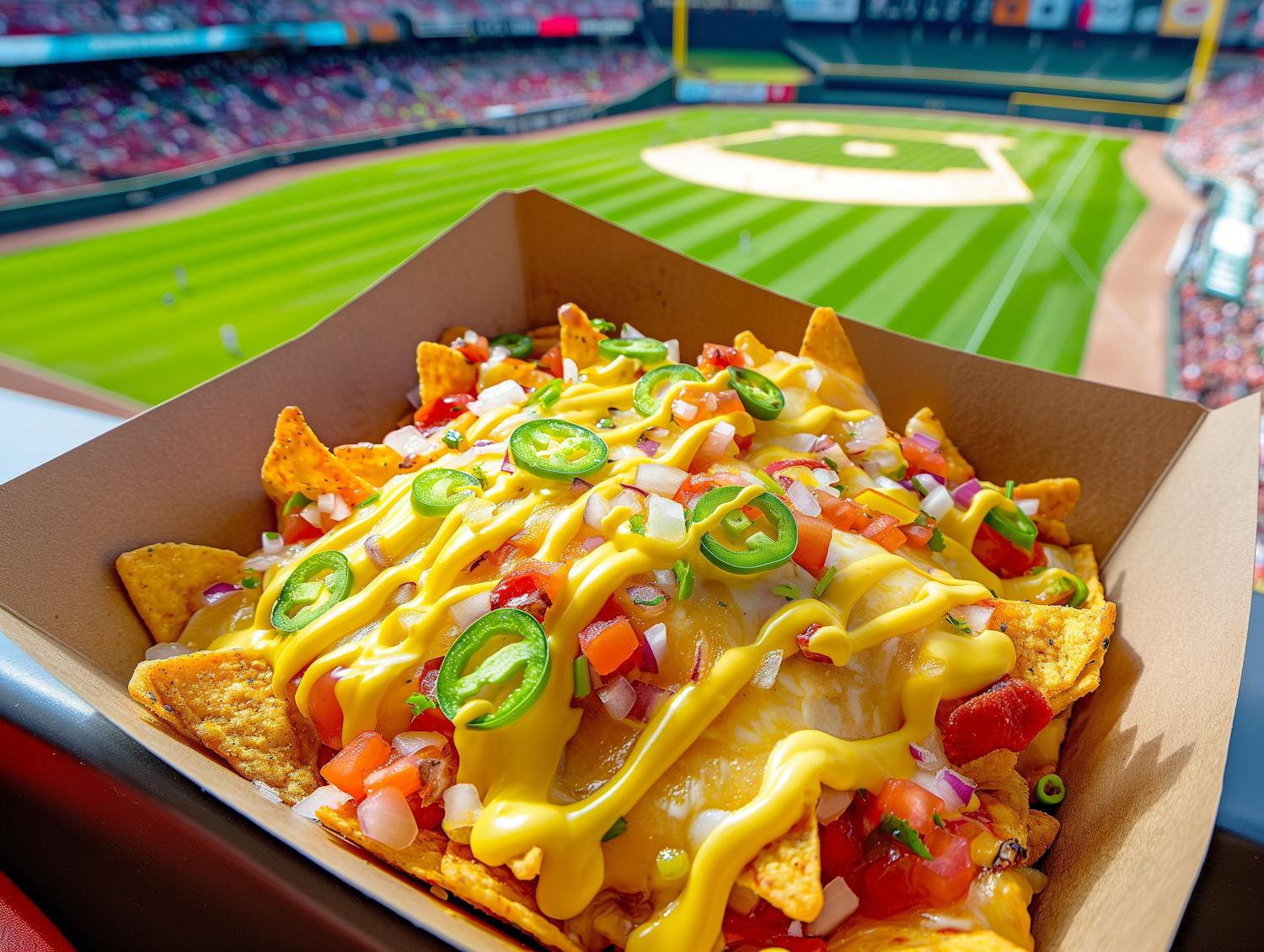 Delicious nachos topped with cheese, jalapeños, and tomatoes at a baseball game, with a vibrant field in the background.