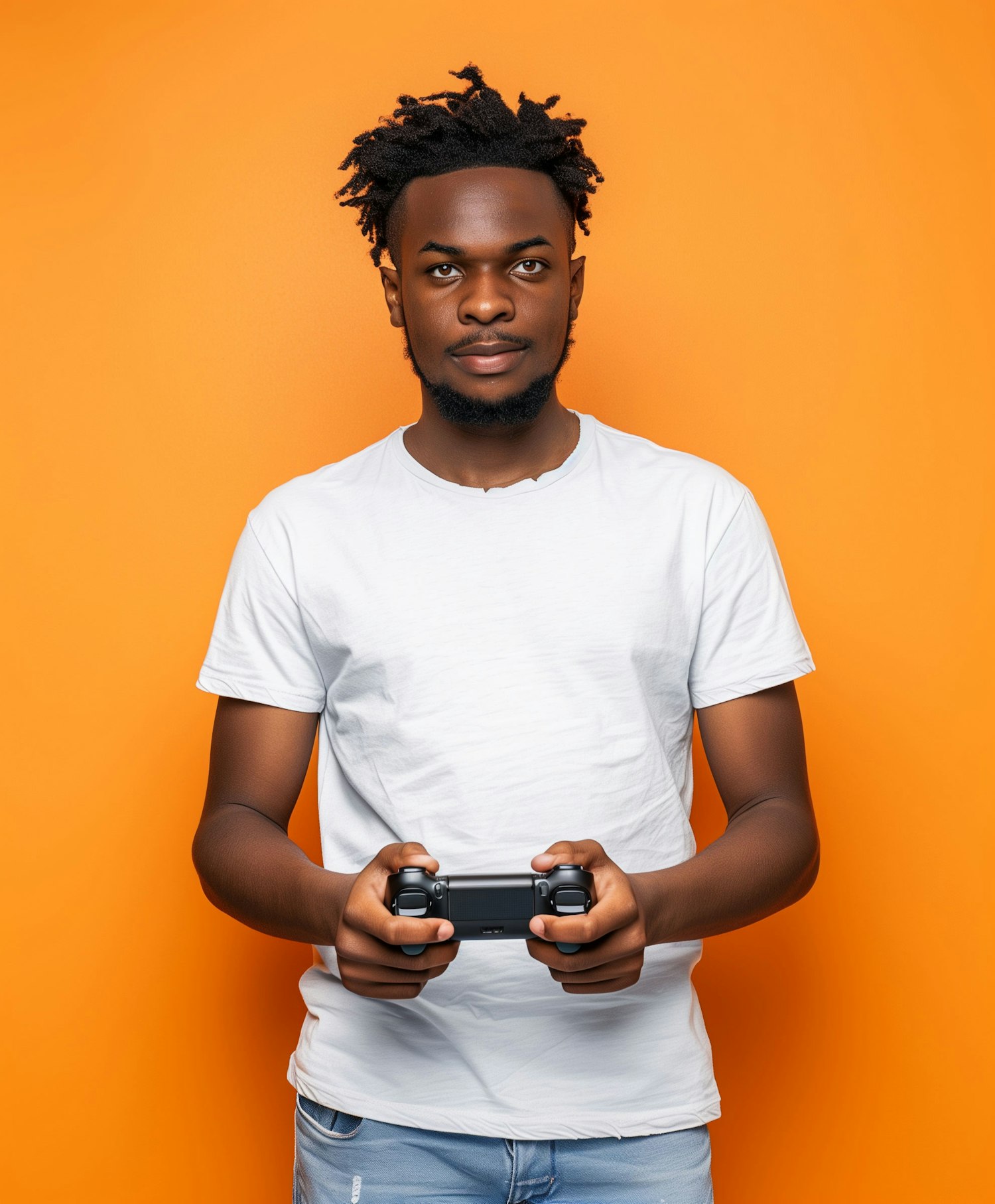 Young man with a gaming controller against a bright orange background, wearing a white t-shirt and jeans.
