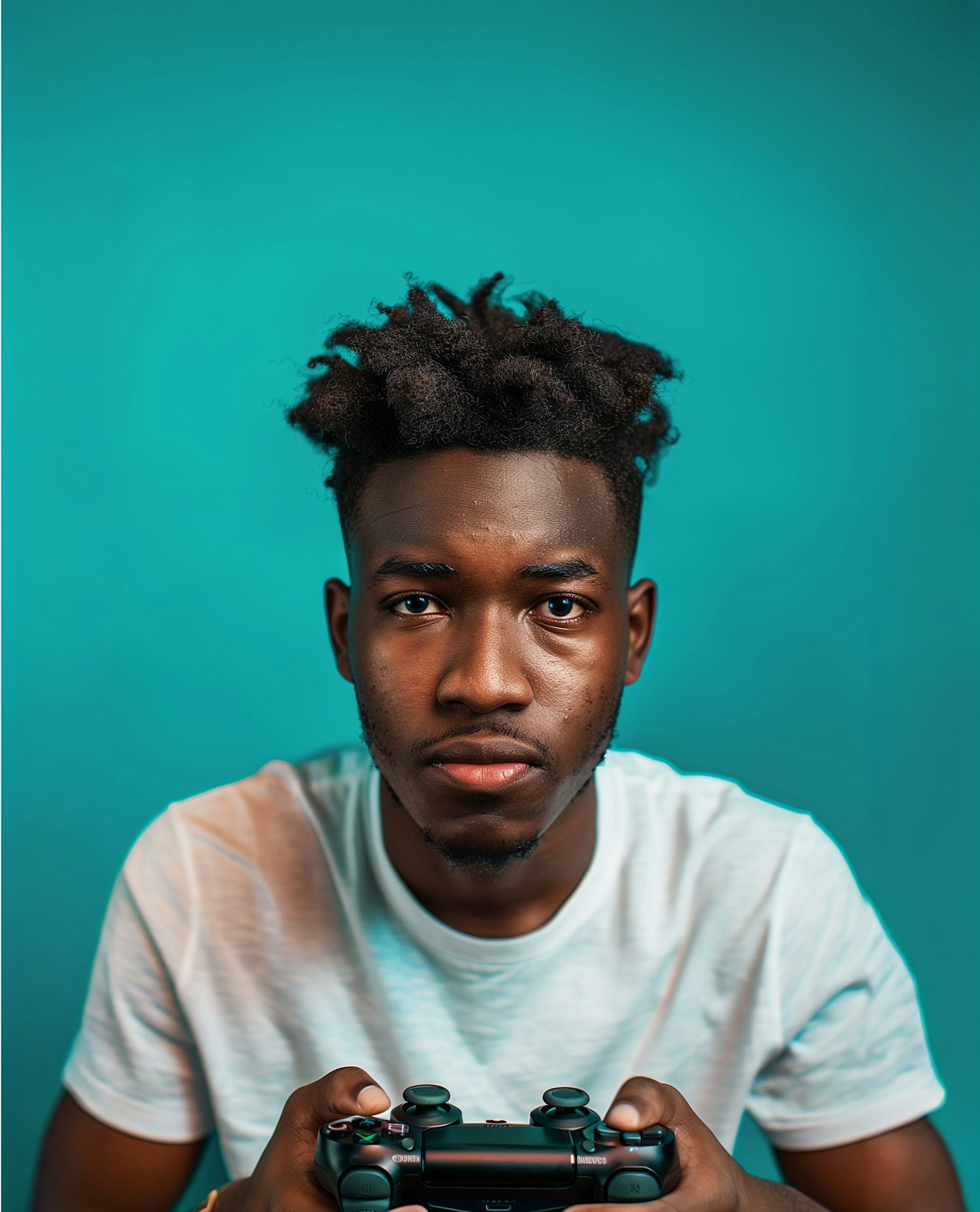 Young man intensely focused on gaming, holding a controller against a teal background. Engaged expression and casual attire.