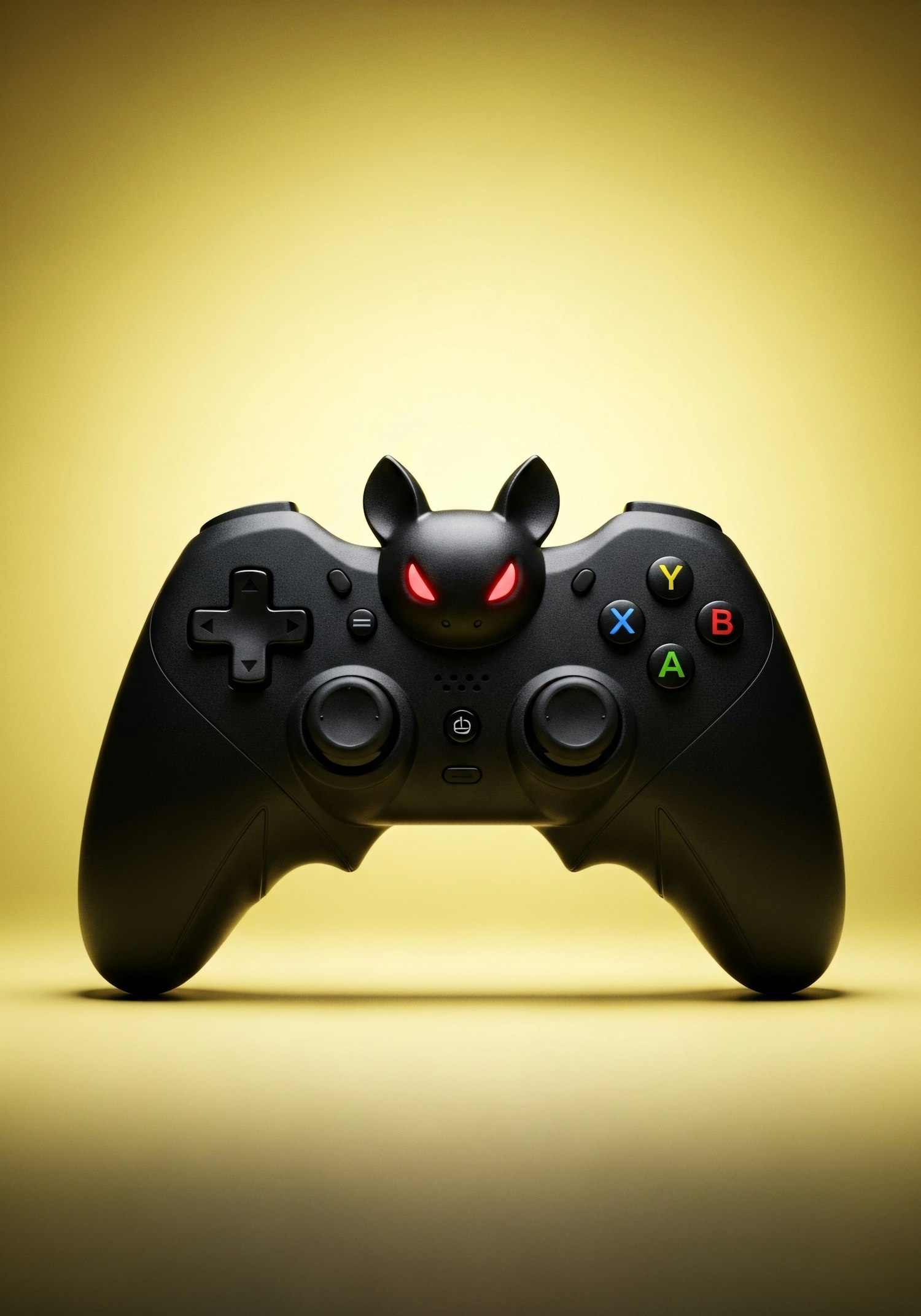 A black gaming controller with glowing red eyes on a yellow background, featuring colorful buttons and a sleek, modern design.