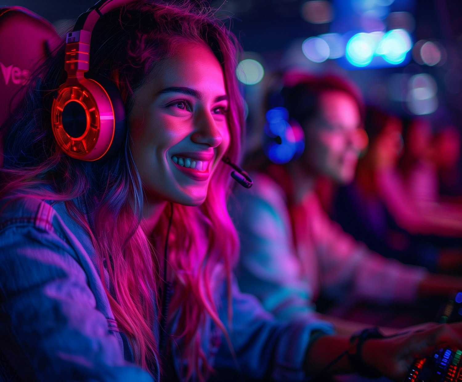 A young woman gaming with a red headset, smiling in vibrant neon lights, surrounded by fellow gamers in a lively atmosphere.