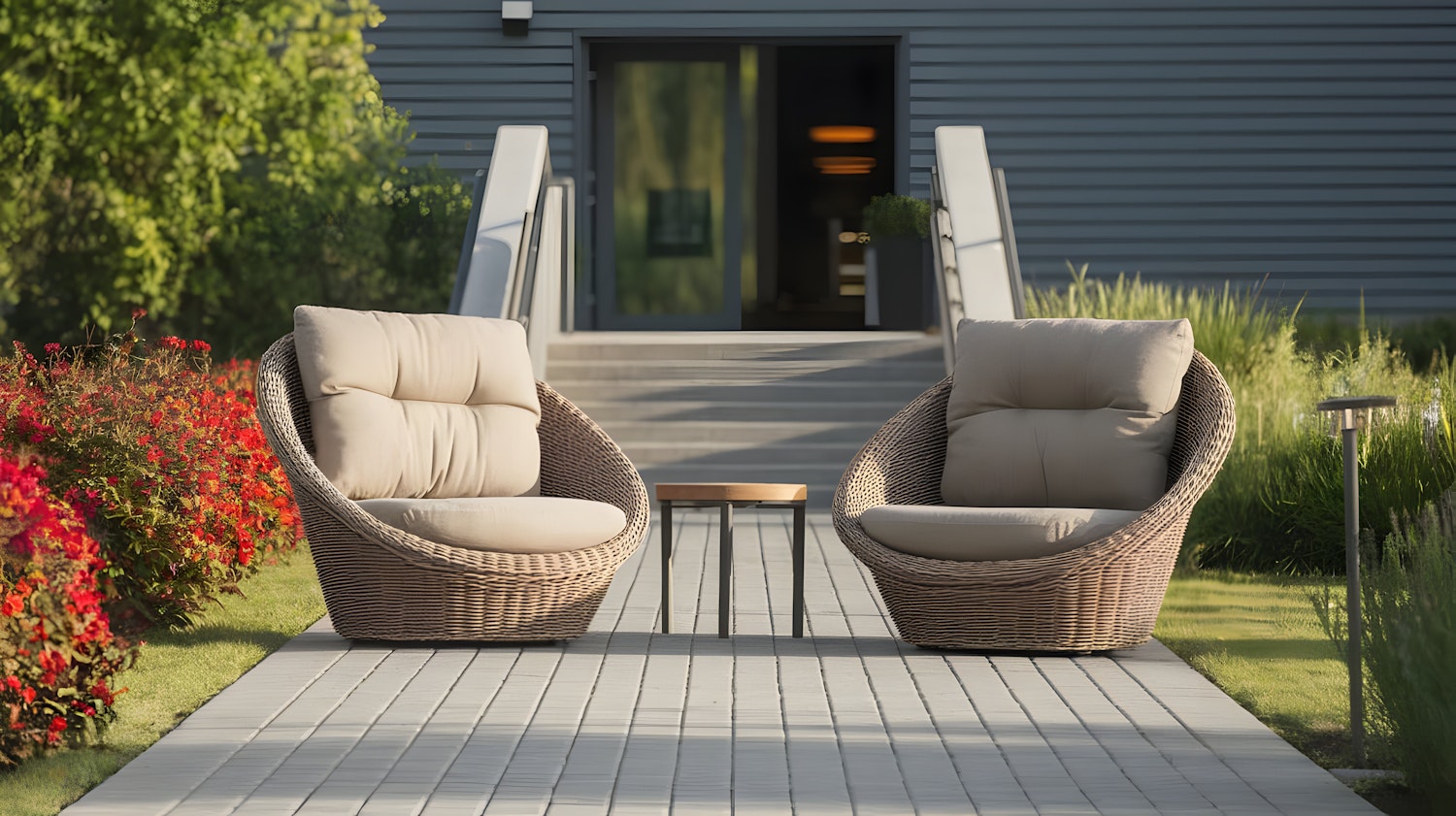 Cozy wicker chairs with beige cushions and a side table in a lush garden, perfect for outdoor relaxation on a sunny day.