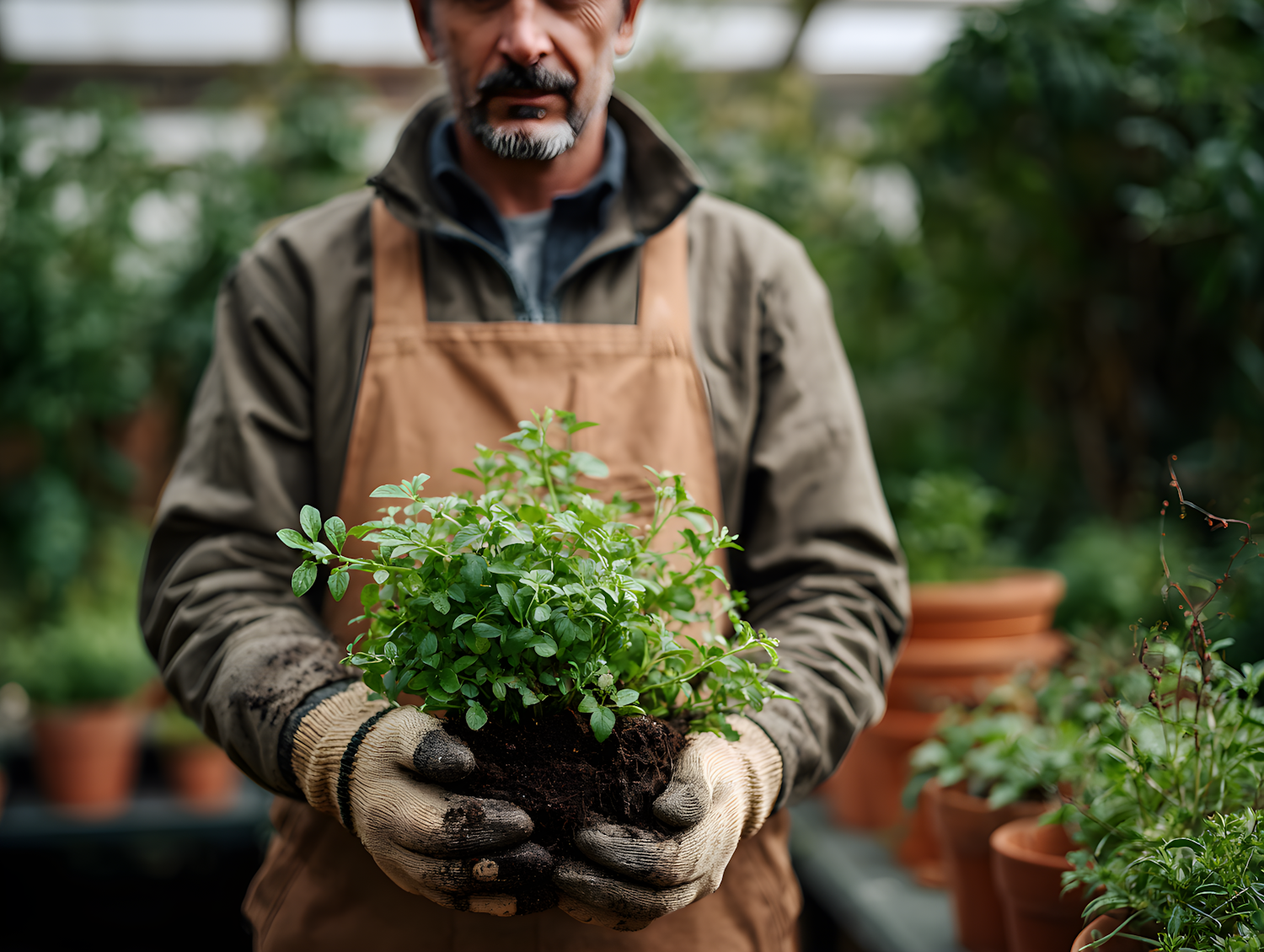A gardener in a greenhouse holding a small plant with soil, wearing gloves and an apron, surrounded by potted plants.