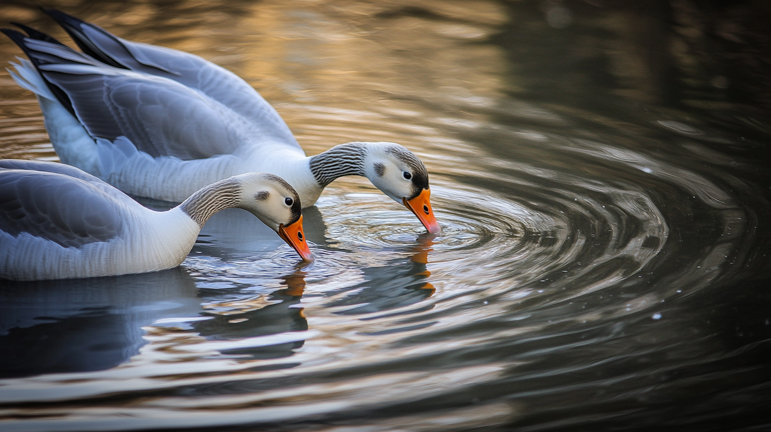 Two bar-headed geese with orange beaks swim gracefully, creating ripples in calm water, reflecting golden hues.