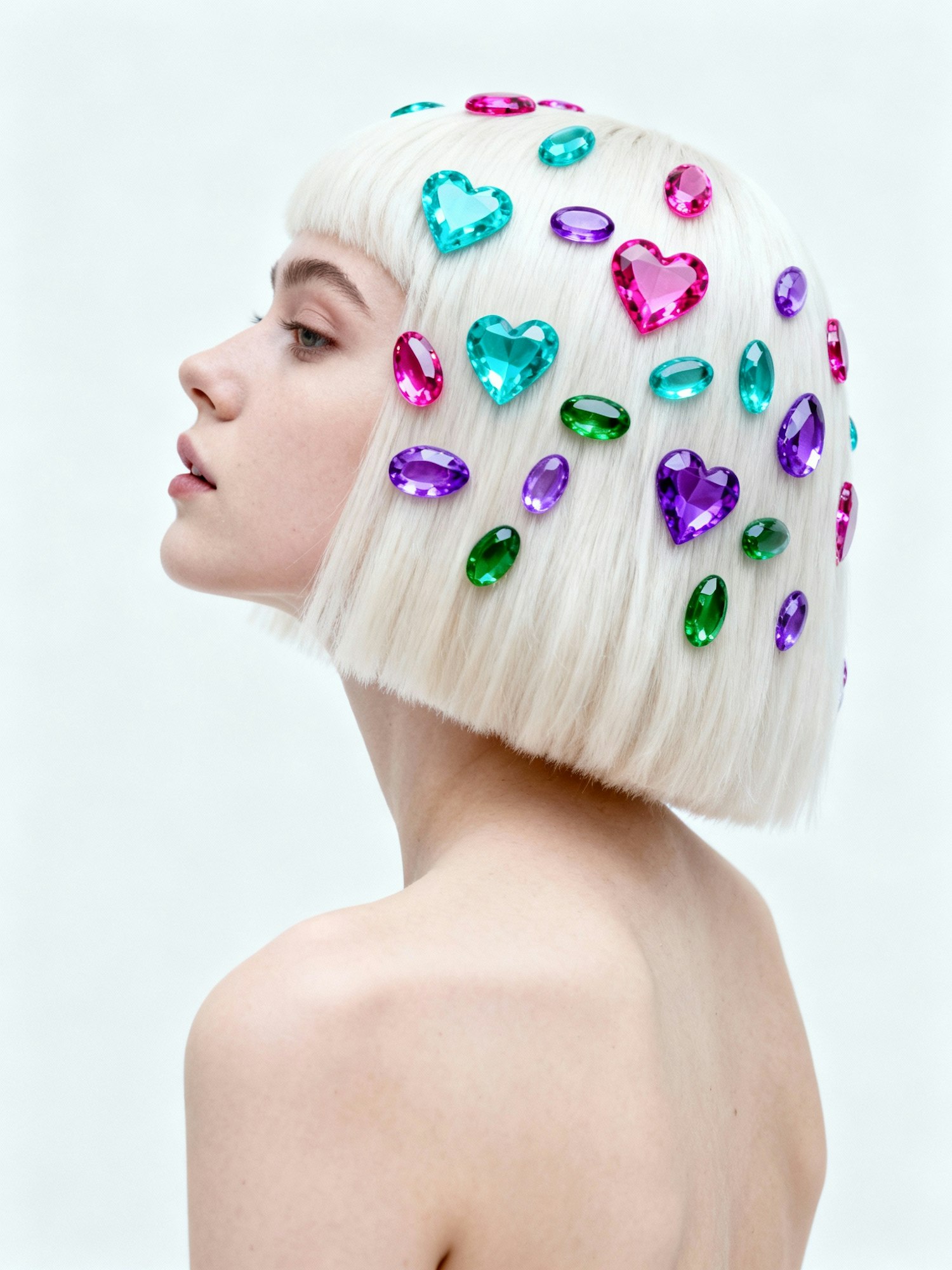 A profile view of a person with platinum blonde hair decorated with colorful gem-like shapes, creating a vibrant and artistic look.
