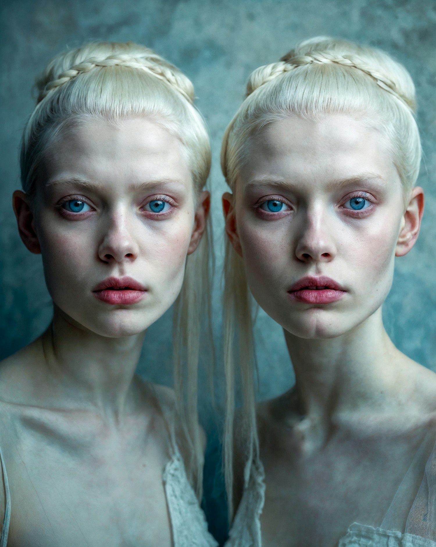 Two ethereal women with platinum blonde hair and blue eyes, styled in braided updos, against a muted blue-green background.