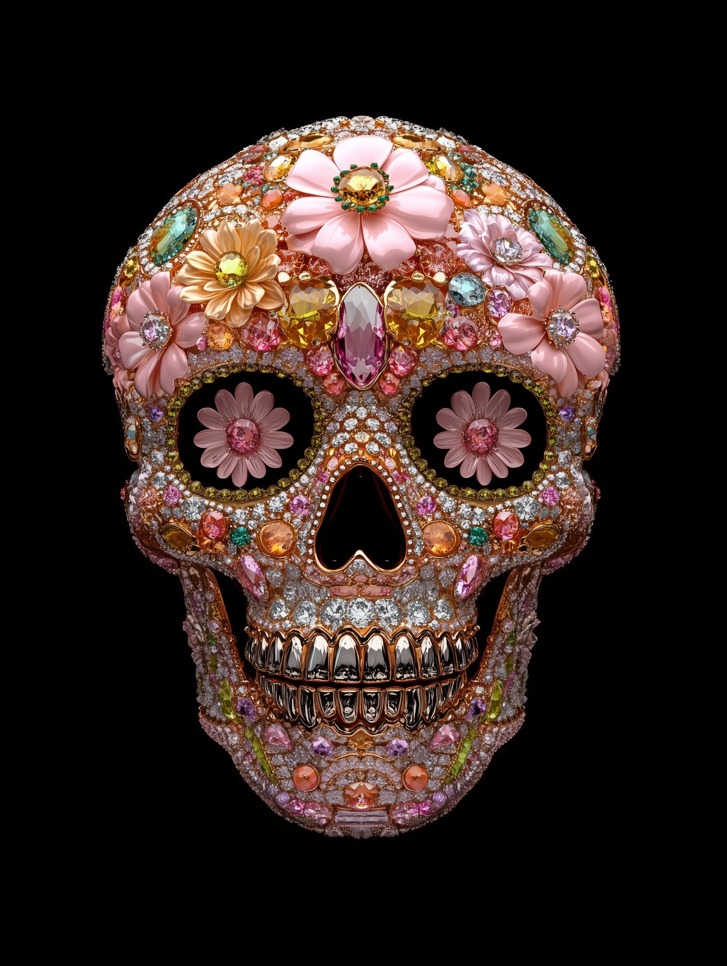 Ornate skull adorned with colorful gemstones and floral designs, featuring pink, yellow, and orange flowers on a black background.