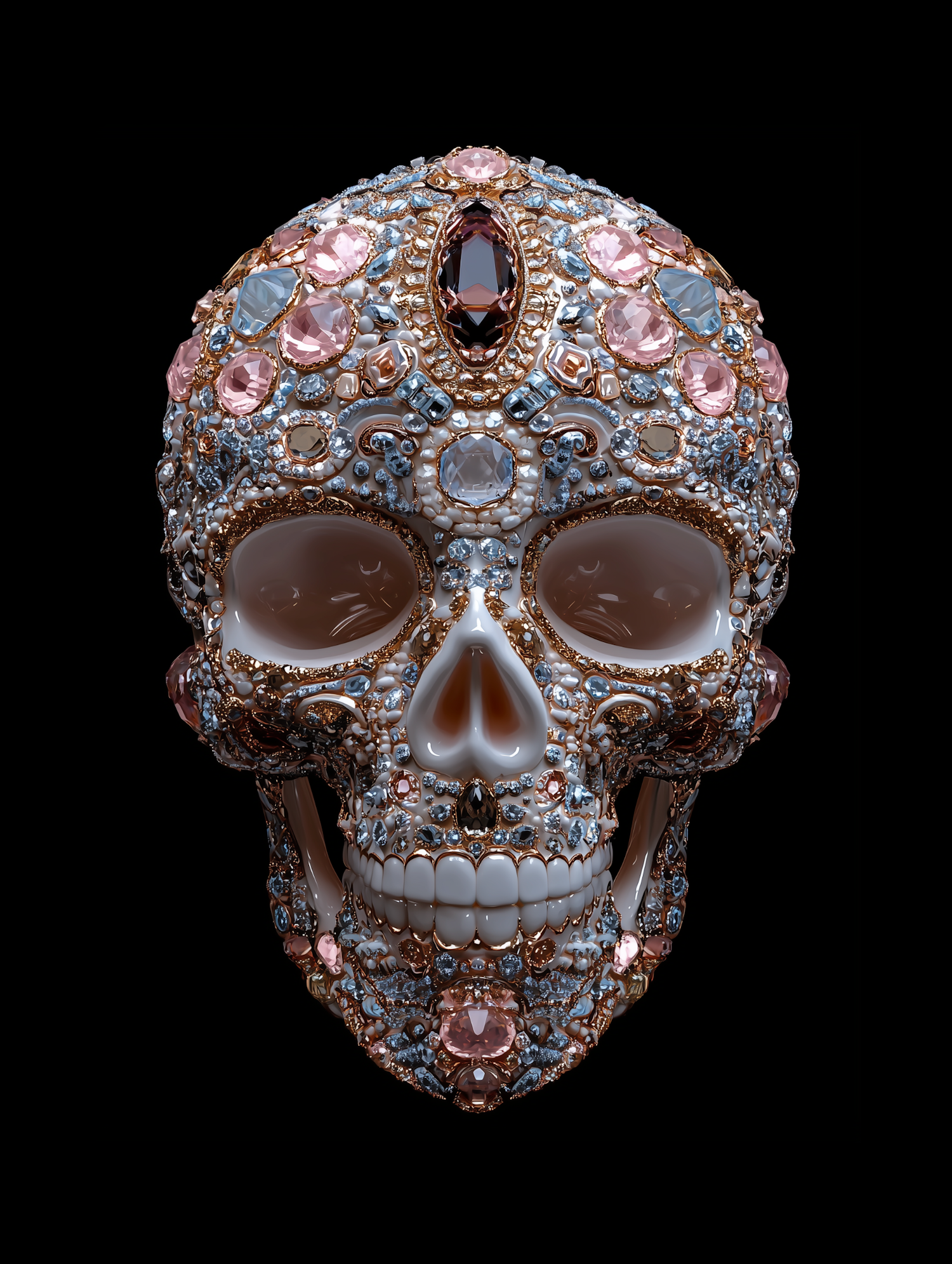 Ornate skull adorned with colorful gemstones and intricate metalwork, blending beauty and macabre art.