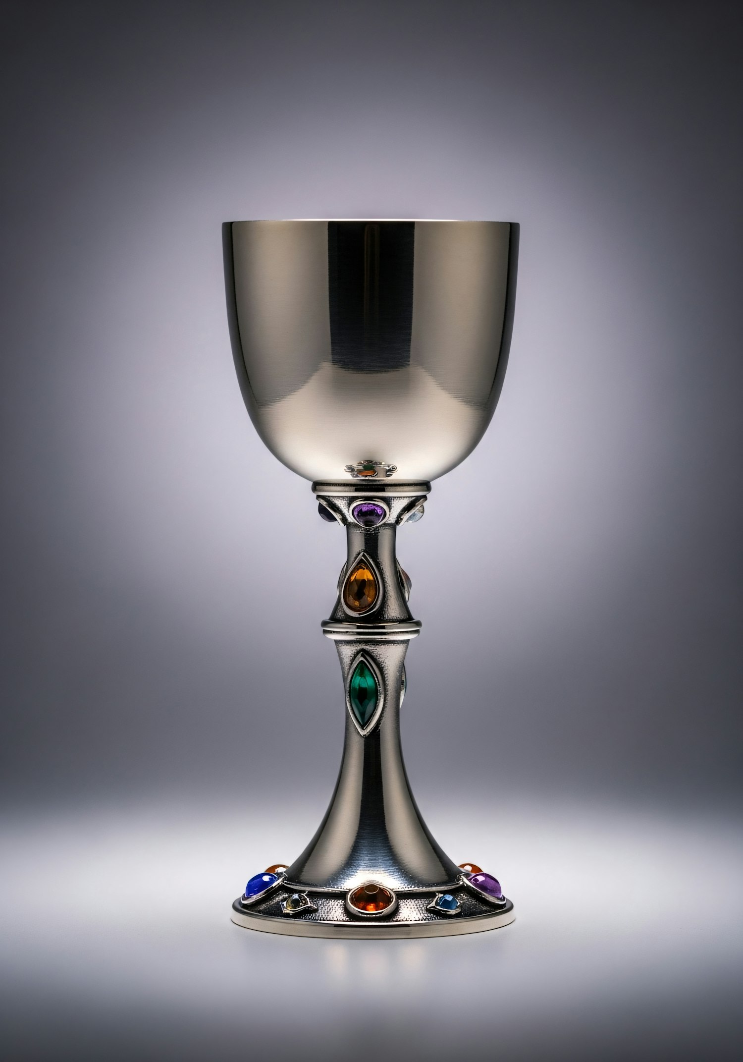 A silver chalice with colorful gemstones and intricate design, set against a soft gray background, showcasing elegance and craftsmanship.