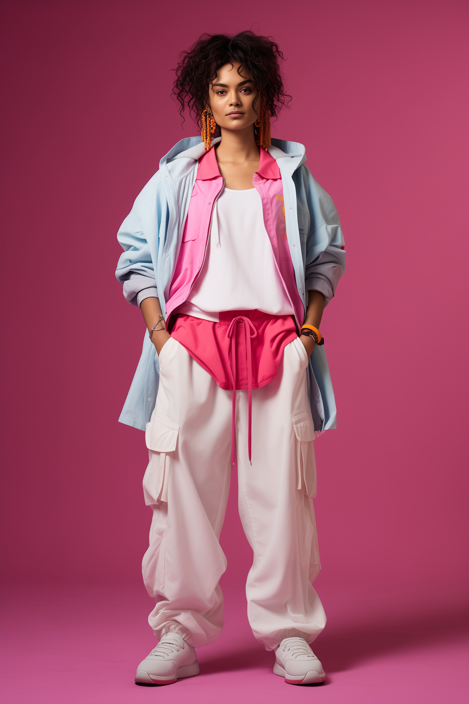 Stylish woman in pastel and bright outfit with curly hair, posing confidently against a pink background.