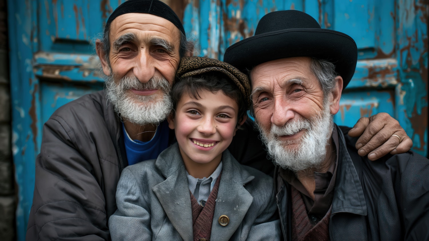 Three generations smiling together in front of a rustic blue door, showcasing warmth and family bonds.