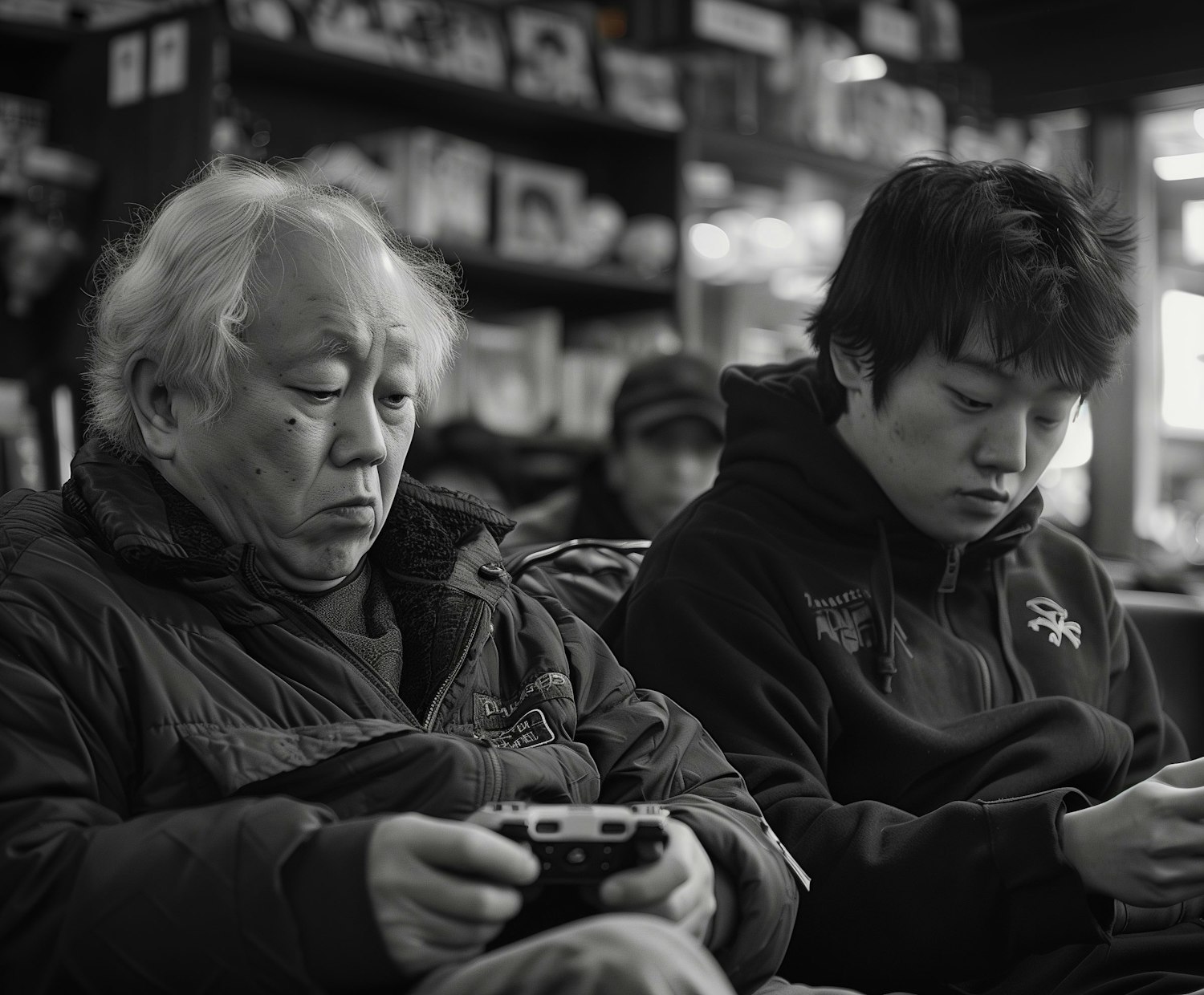 Elderly man and young man engrossed in gaming and smartphone in a cozy room with shelves in the background.