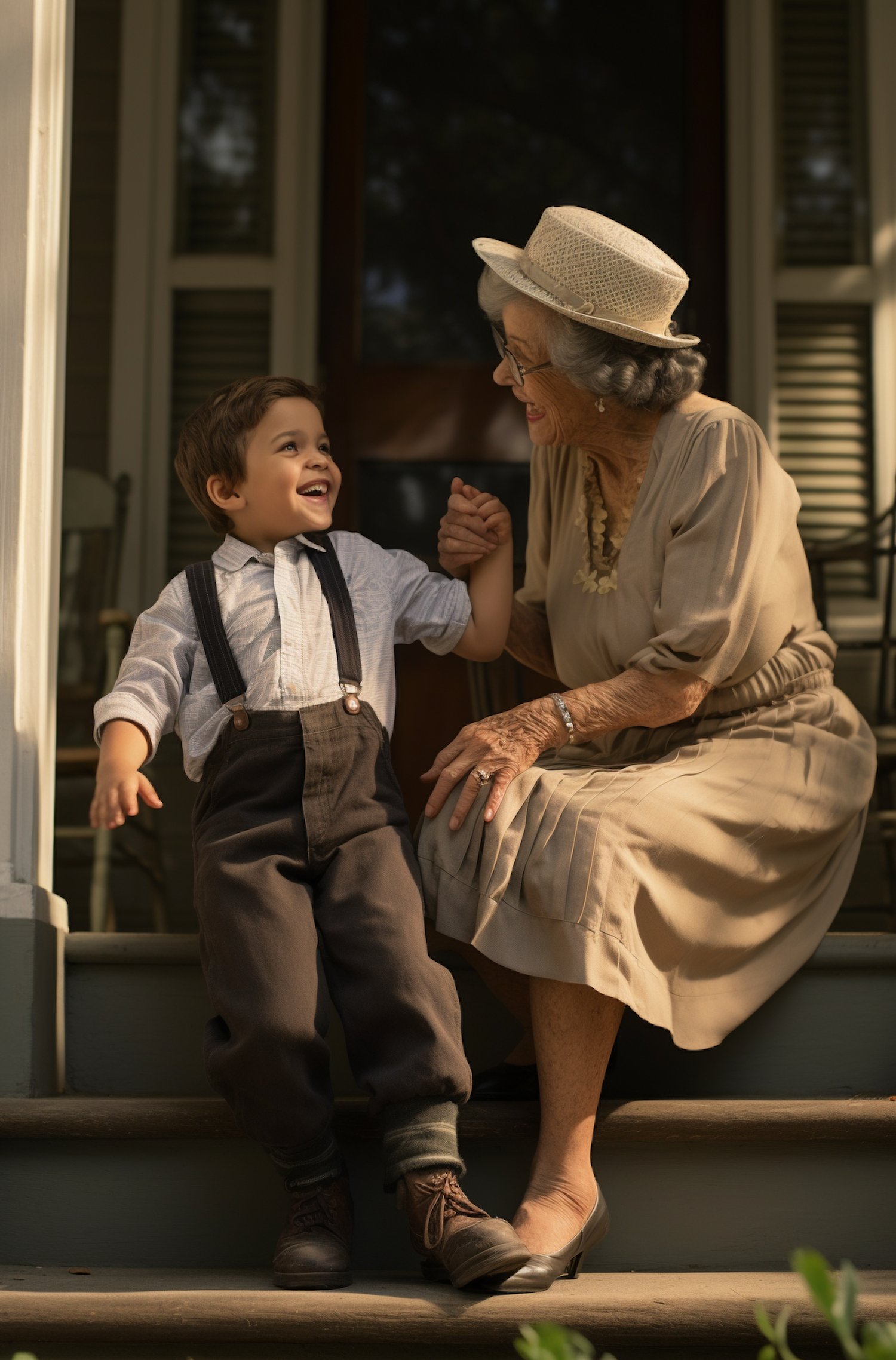 A young boy and elderly woman share a joyful moment on a porch, holding hands and smiling warmly at each other.
