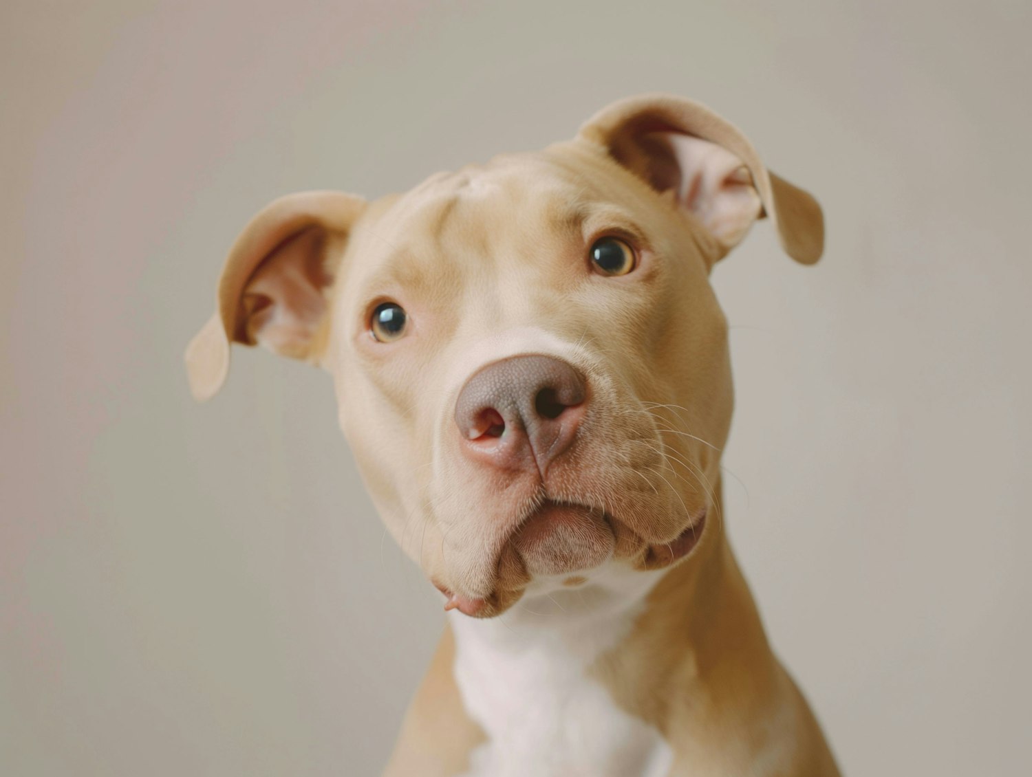 Adorable light brown pit bull with a white chest, curious expression, and soft pink nose against a neutral gray background.