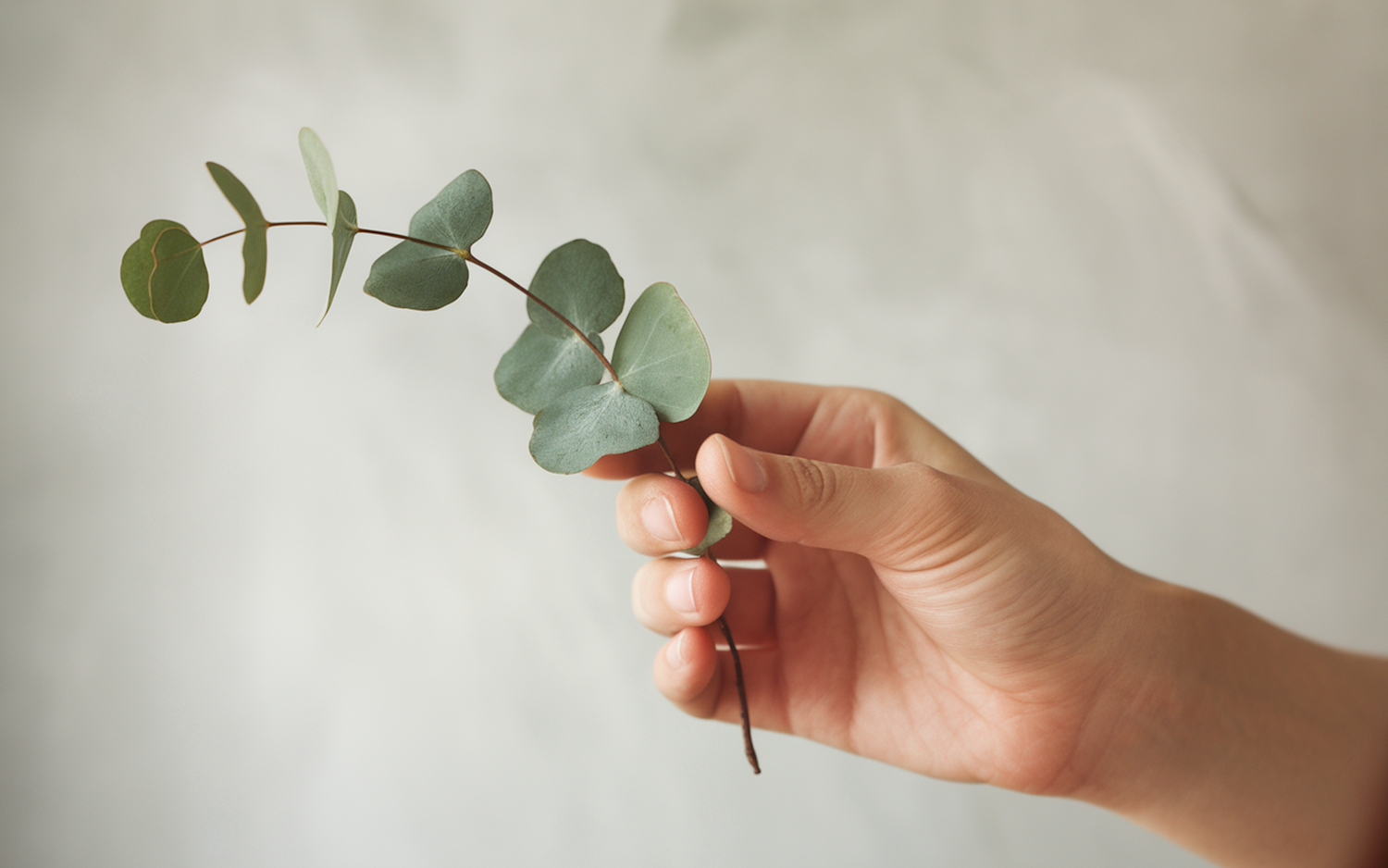 Close-up of a hand holding a eucalyptus branch, showcasing delicate green leaves against a soft gray background.
