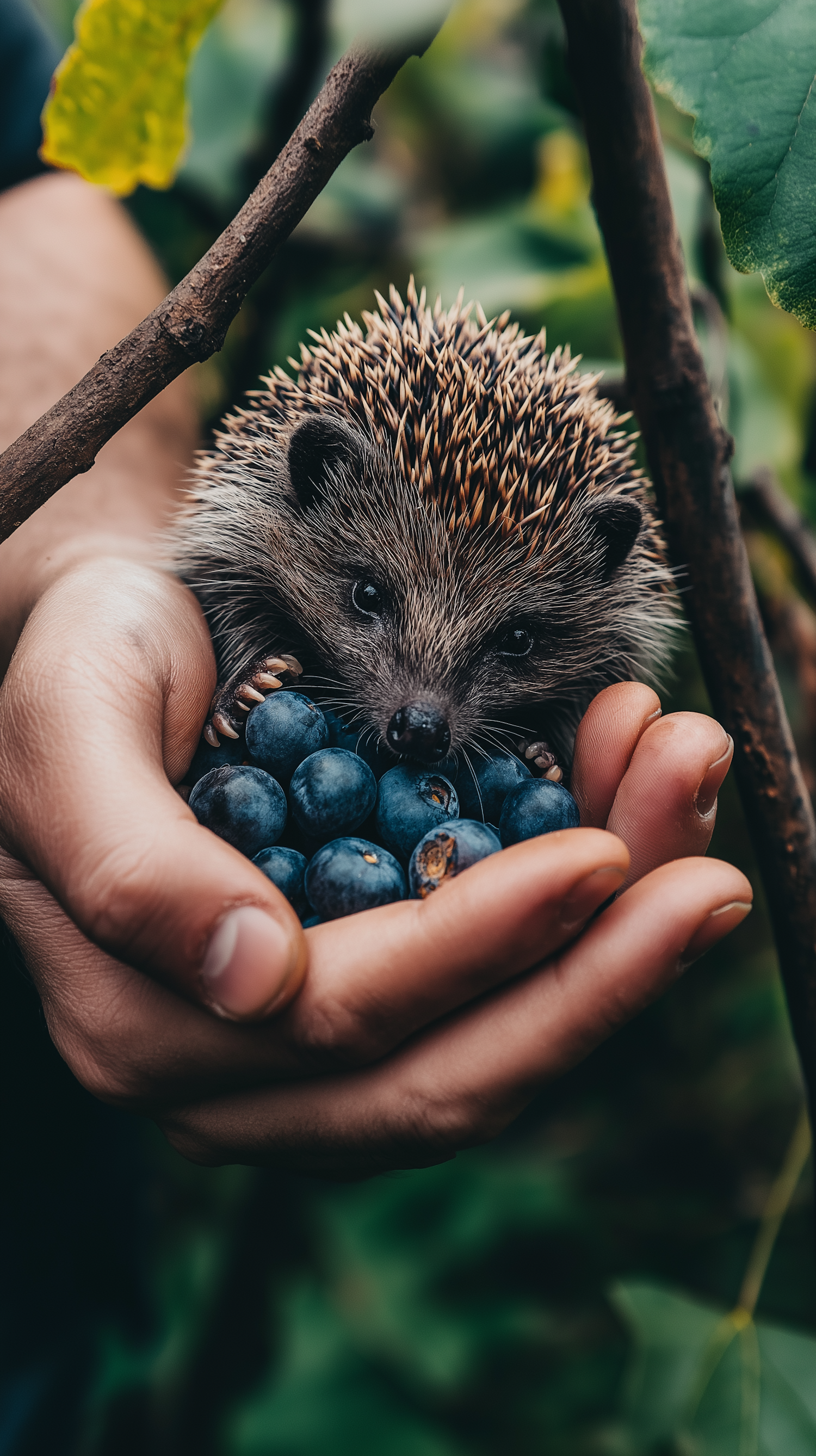 A cute hedgehog nestled in hands with blueberries, surrounded by green leaves. A heartwarming nature scene.