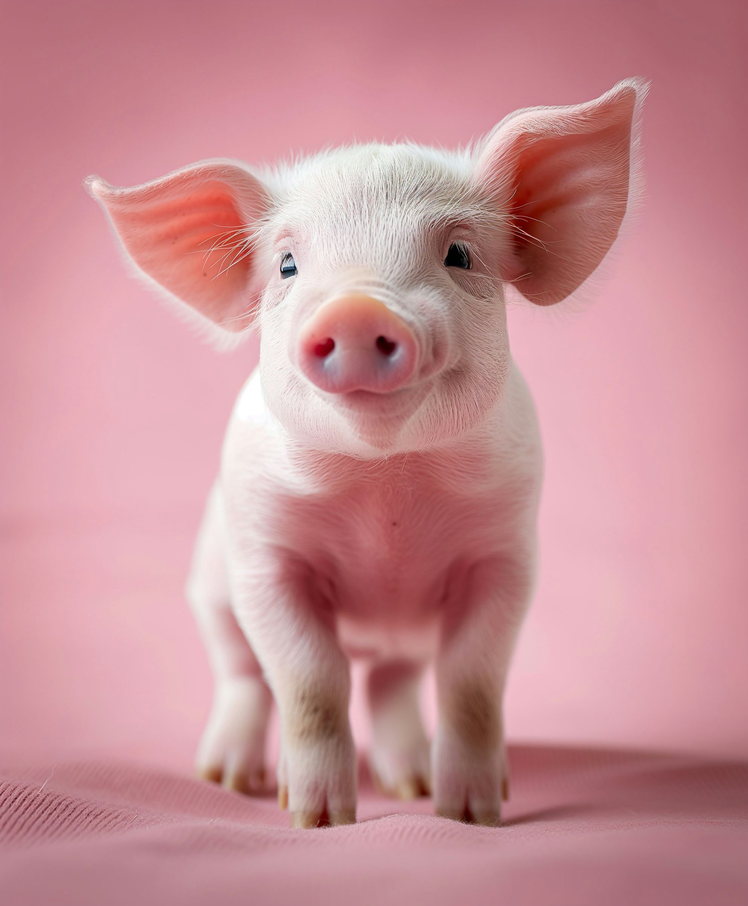 Adorable piglet with perked ears and bright eyes against a soft pink background, exuding charm and playfulness.