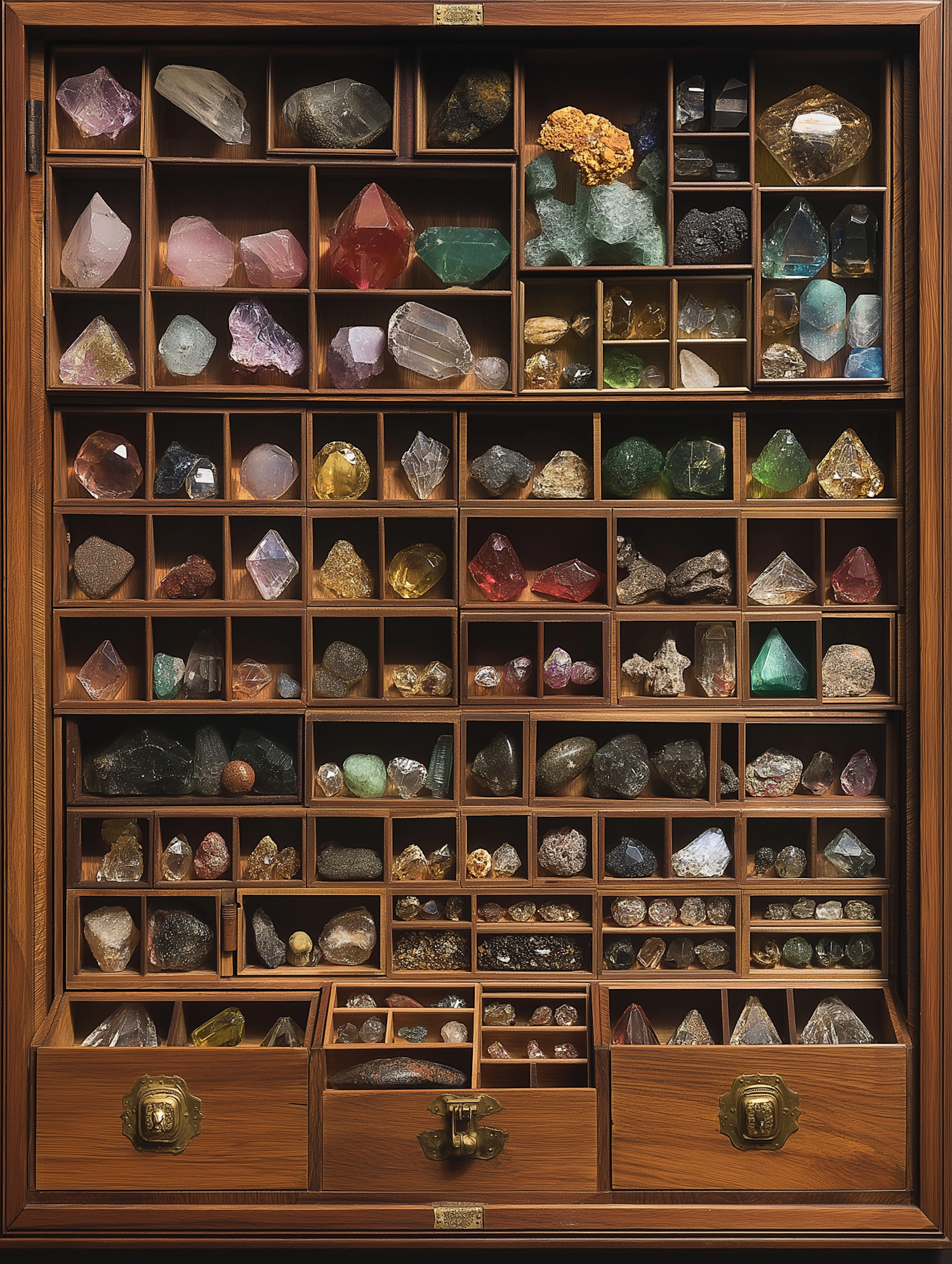 A wooden display case filled with colorful minerals and crystals, showcasing a variety of shapes and sizes in neatly arranged compartments.