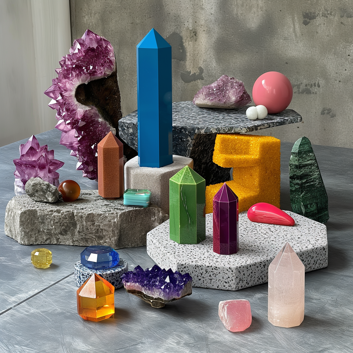 Vibrant geometric crystals and stones arranged artistically on a textured surface, featuring amethyst clusters and colorful faceted shapes.