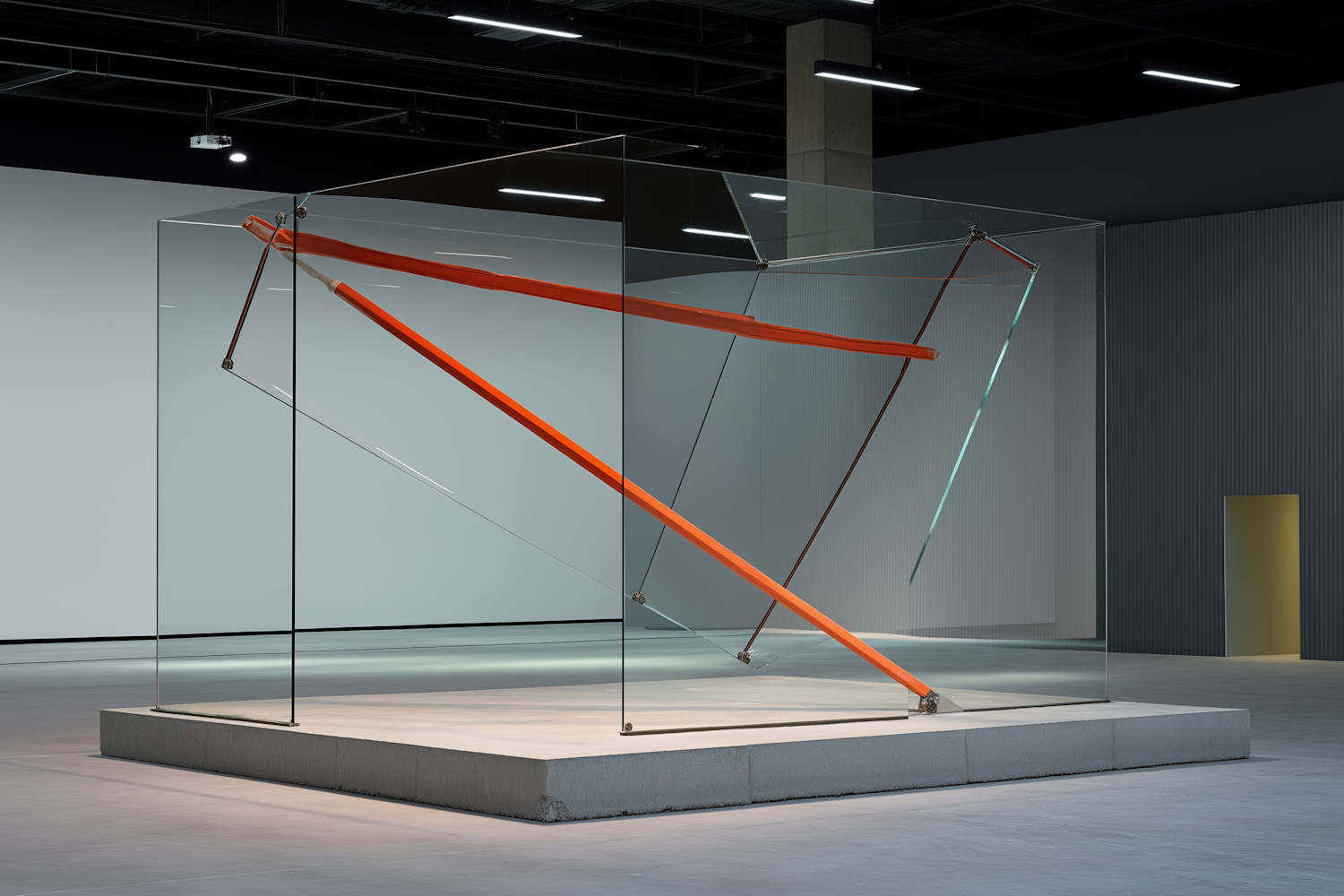 Modern art installation with orange rods in a glass cube on a concrete base, set in a minimalist gallery space.