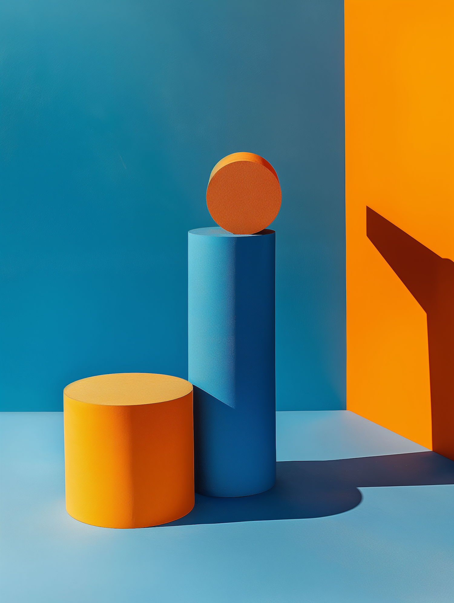 Minimalist geometric shapes in vibrant orange and blue, creating a striking contrast with sharp shadows and clean lines.
