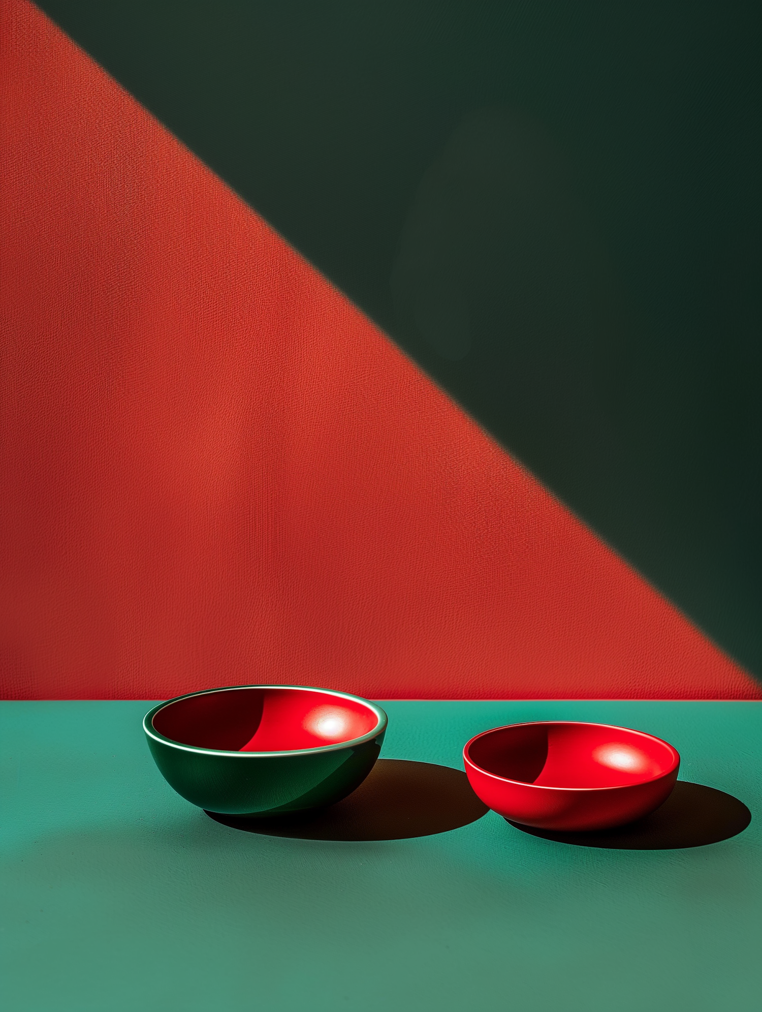 Minimalist scene with two colorful bowls against a striking red and green background, creating a dramatic visual contrast.