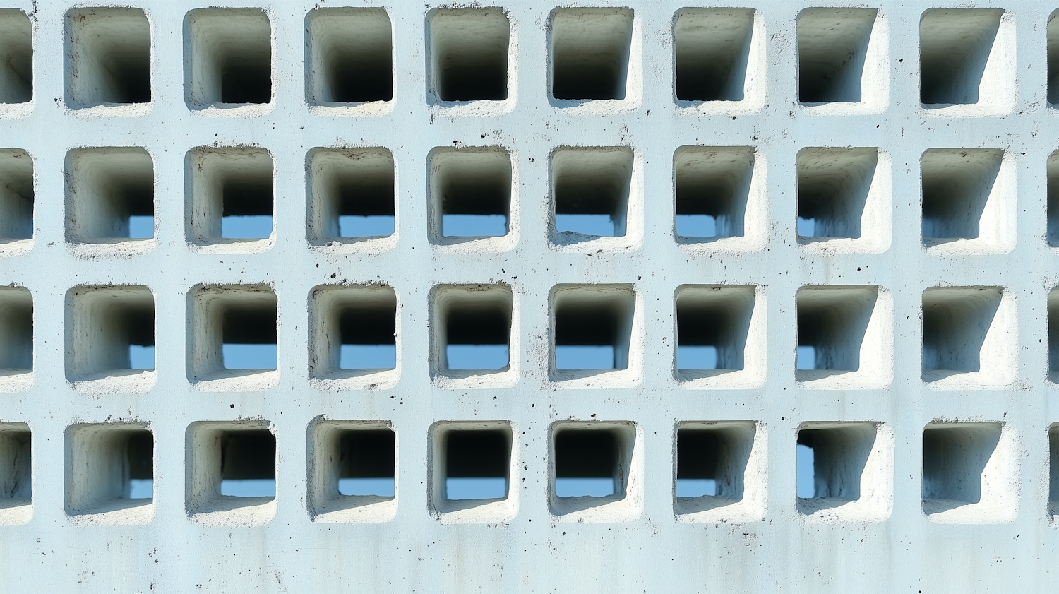 Symmetrical grid of square openings in a light blue concrete wall, revealing blue sky beyond. Geometric pattern with light and shadow play.