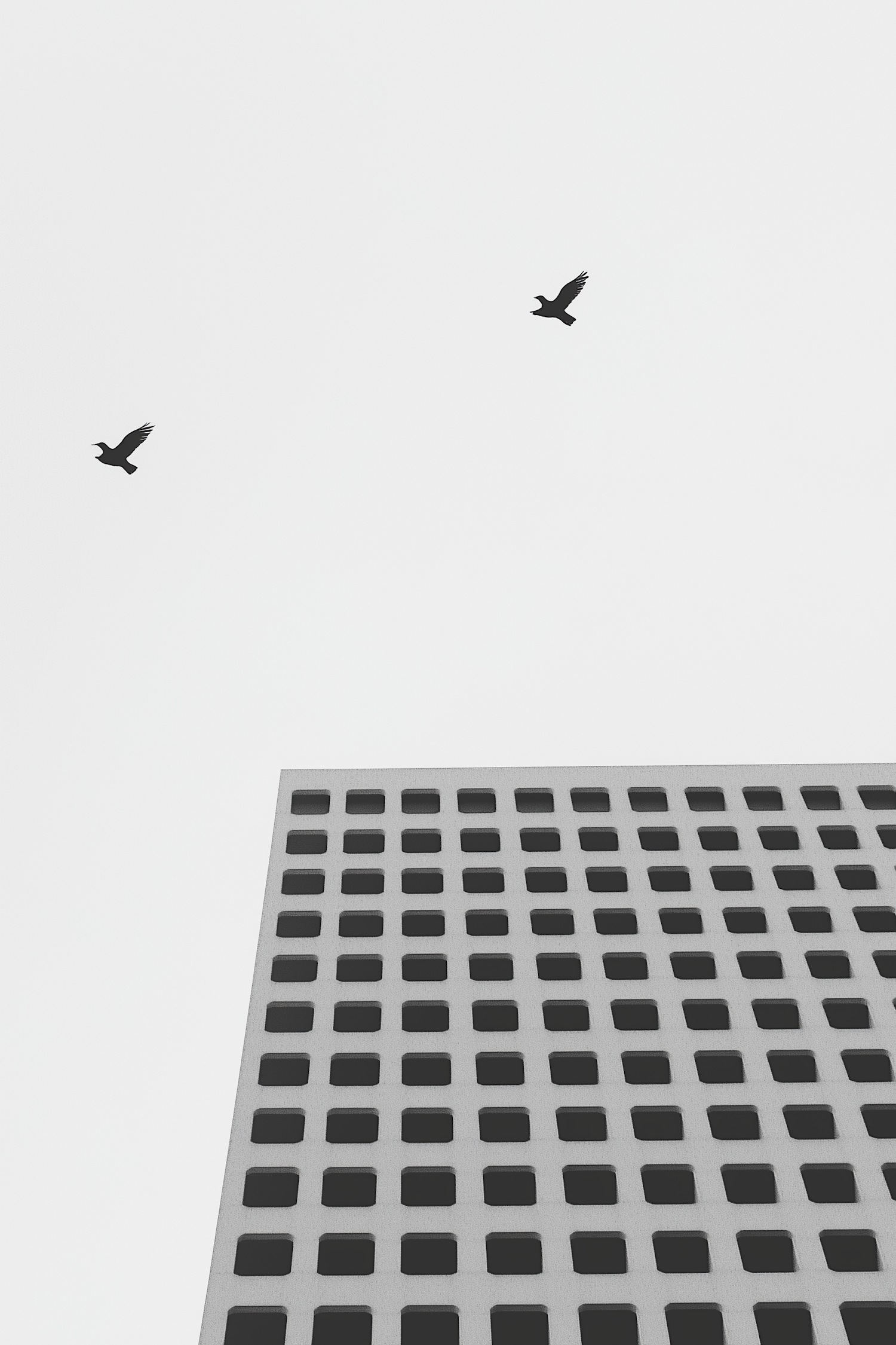 Minimalist photo of two birds flying over a grid-patterned building against a pale sky.